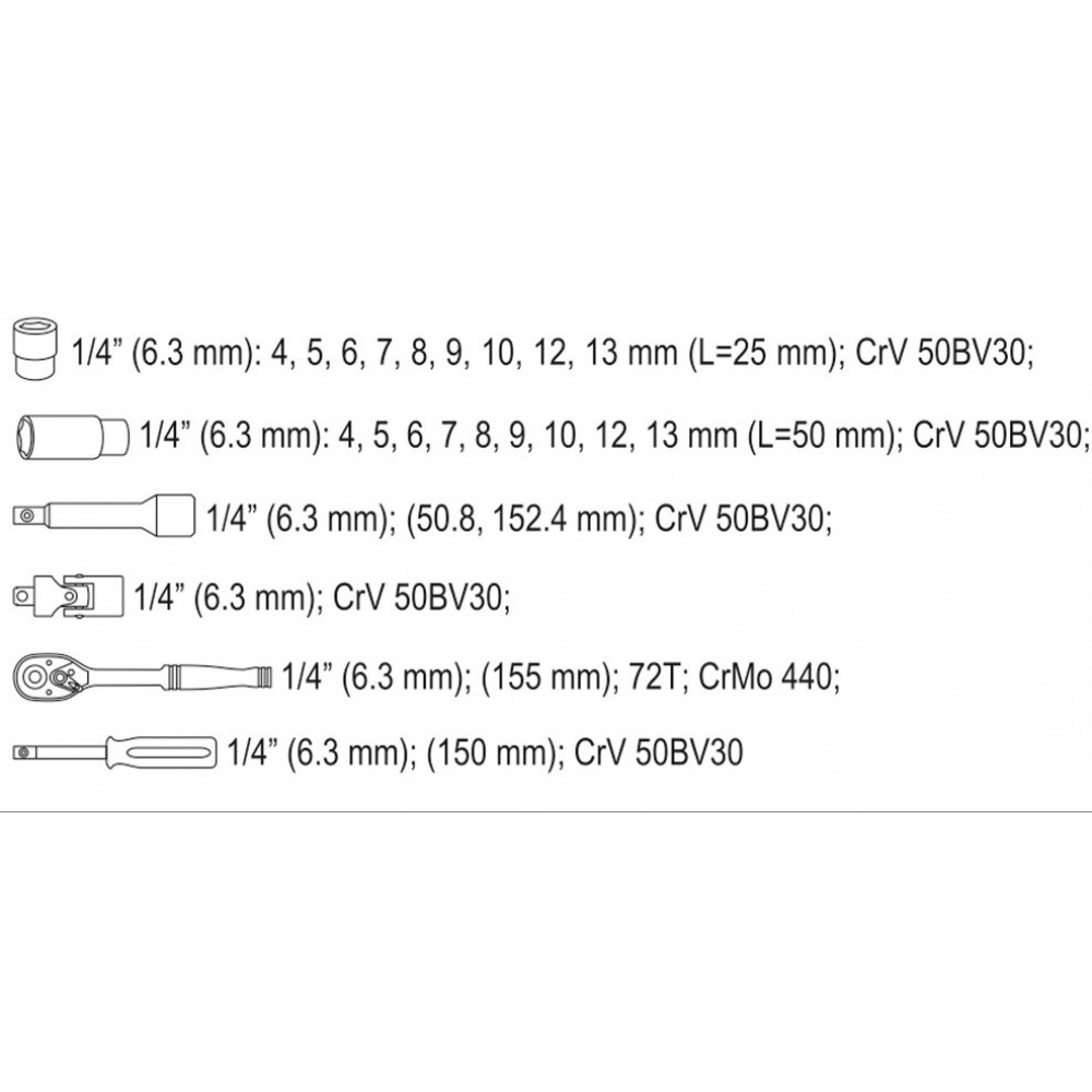 - головки торцевые 1/4" (25 мм): 4; 5; 6; 7; 8; 9; 10; 12; 13 мм;