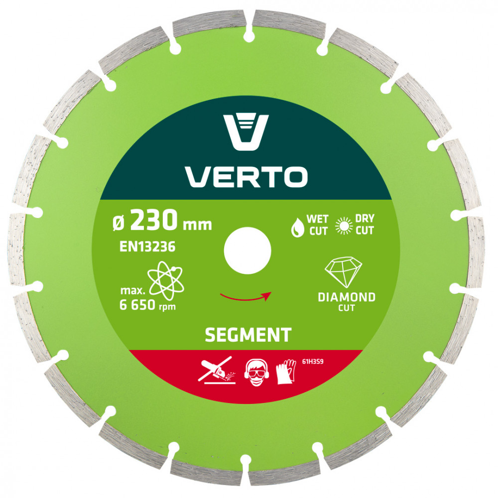 Алмазный круг сегментный VERTO позволяет эффективно резать изделия, изготовленные из бетона, армированного бетона, гранита, мрамора, камня, кирпича и т.п. Бренд VERTO предлагает ассортимент электроинструмента и рабочих принадлежностей для каждого домашнего мастера.