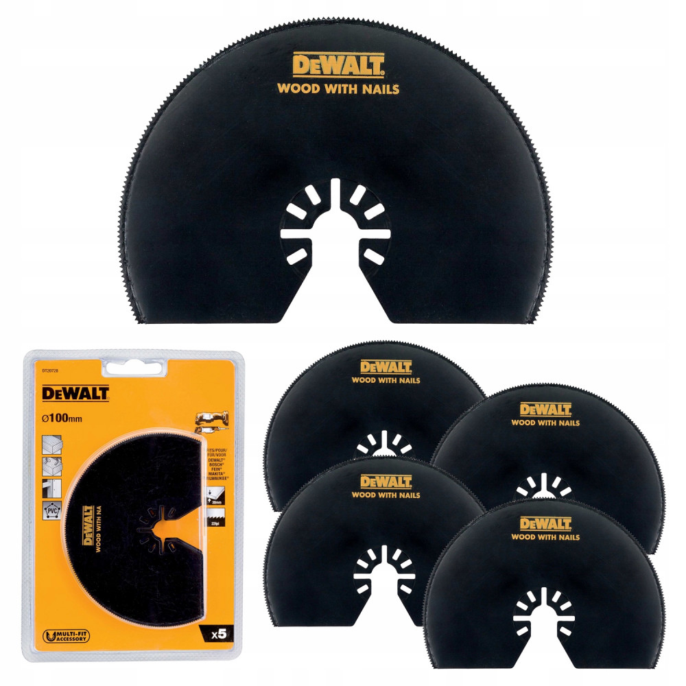 Диск пильный сегментированный для мультитула (BIM, 100 мм, 5 шт.) DEWALT DT20728 подойдет для работы с деревянными изделиями, в том числе с гвоздями.
