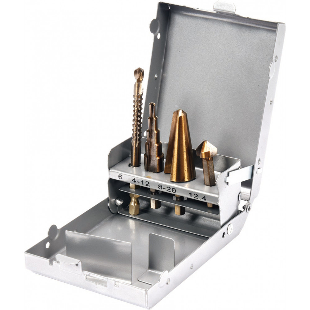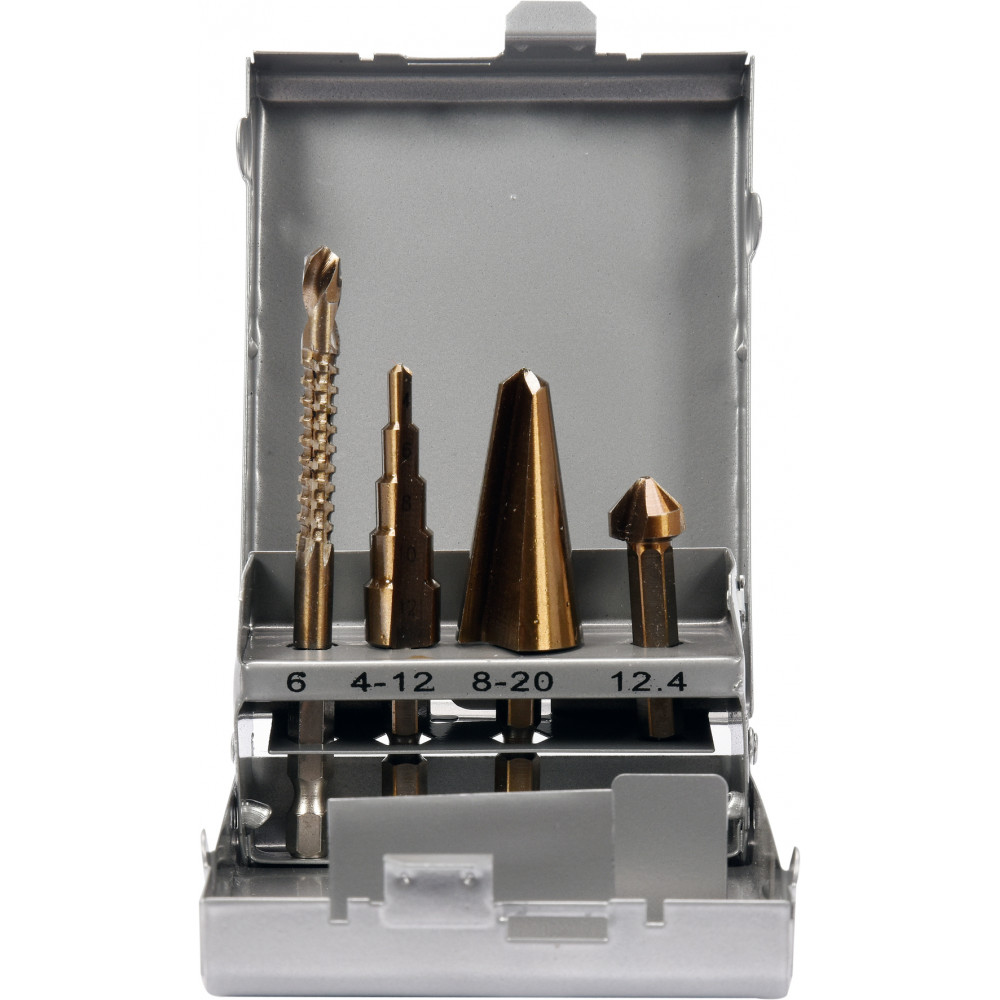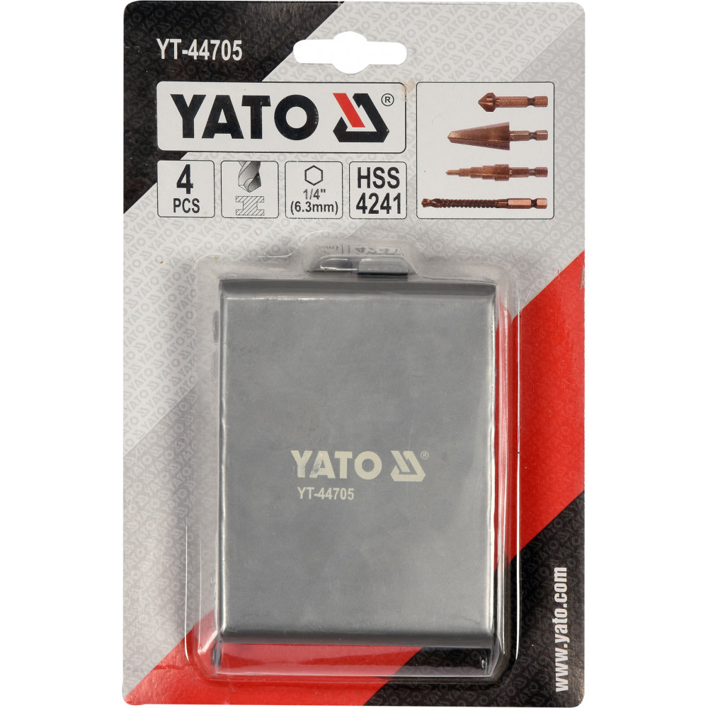 Набор универсальных сверл YT-44705 с шестигранным хвостовиком марки YATO содержит развертку, конический зенкер, ступенчатое сверло и фрезерное сверло. Инструменты были изготовлены из однородной, сверхпрочной инструментальной стали HSS 4241. Они позволяют сверлить в металле, алюминии, латуни, нержавеющей стали и пластмассах.