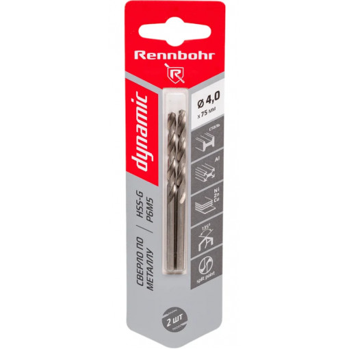 Сверло 675040 по металлу ЦХ, 4,0х75мм, HSS-G, P6M5, 2шт/уп,RENNBOHR DYNAMIC CARD 4 75 2