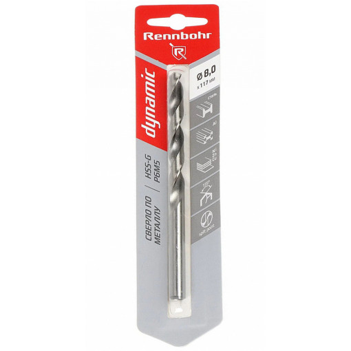 Сверло 675080 по металлу ЦХ, 8,0х117мм, HSS-G, P6M5, 1шт/уп,RENNBOHR DYNAMIC CARD 8 117 1