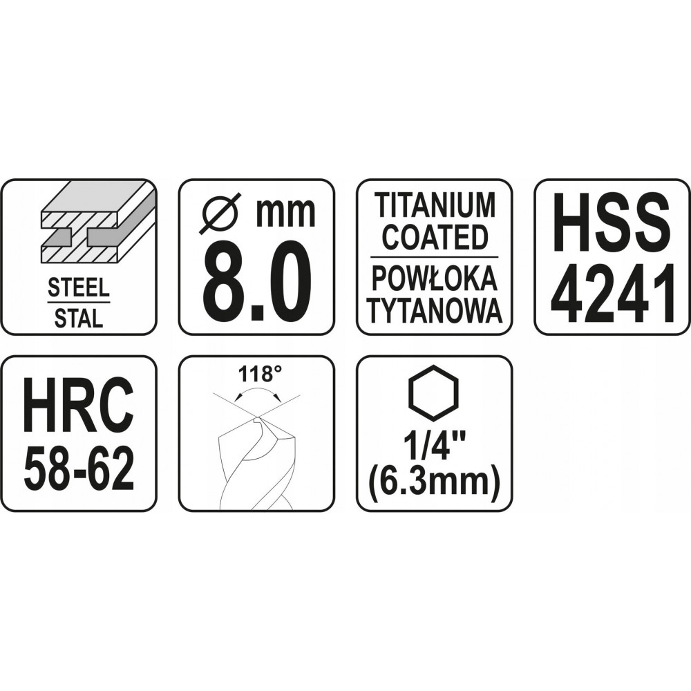 Отшлифованная поверхность обеспечивает идеальную точность сверления. Твердое покрытие твердостью 58–62 HRC, покрытое нитридом титана, сохраняет устойчивость к повреждениям и затуплению, сохраняя геометрию сверл. Более низкая температура сверления и быстрый отвод тепла не вызывают плавление цинка и последующую коррозию сверл. Более низкий коэффициент трения снижает налипание стружки и опилок на сверла. Шестигранный хвостовик 1/4″ (6,3 мм).
