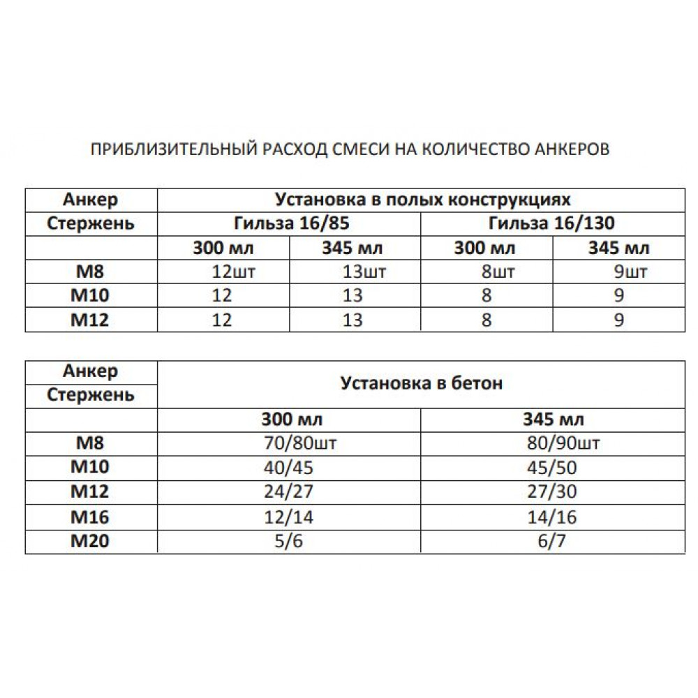 Комментарий: Использовал для крепления каркаса из стальной трубы в пазогребневые стены, монолитное перекрытие и стяжку дерьмого качества, шпилька 8 и 10 диаметра. Бурил на 2 мм больше, чем диаметр шпильки.Отверстие чистил ершиком (брал в кастораме, т.к. у магазин очень дорогие ершики) + продувал насосом для велика.На хорошей шпильке (касторам или метиза) тестировали, ключом + труба рвем шпильку, анкер держится и в пазогребне и в стяжке и в перекрытии.Пистолет обычный для герметика, всё давится, не знаю о чем ноют "умельцы" ниже в отзывахЗЫ Шпилька из магазин ужасная, просто резьбу съедаешь при затяжке, на некоторые 3-4 гайки пришлось ставить, т.к. контр гайкой слизываешь резьбу.