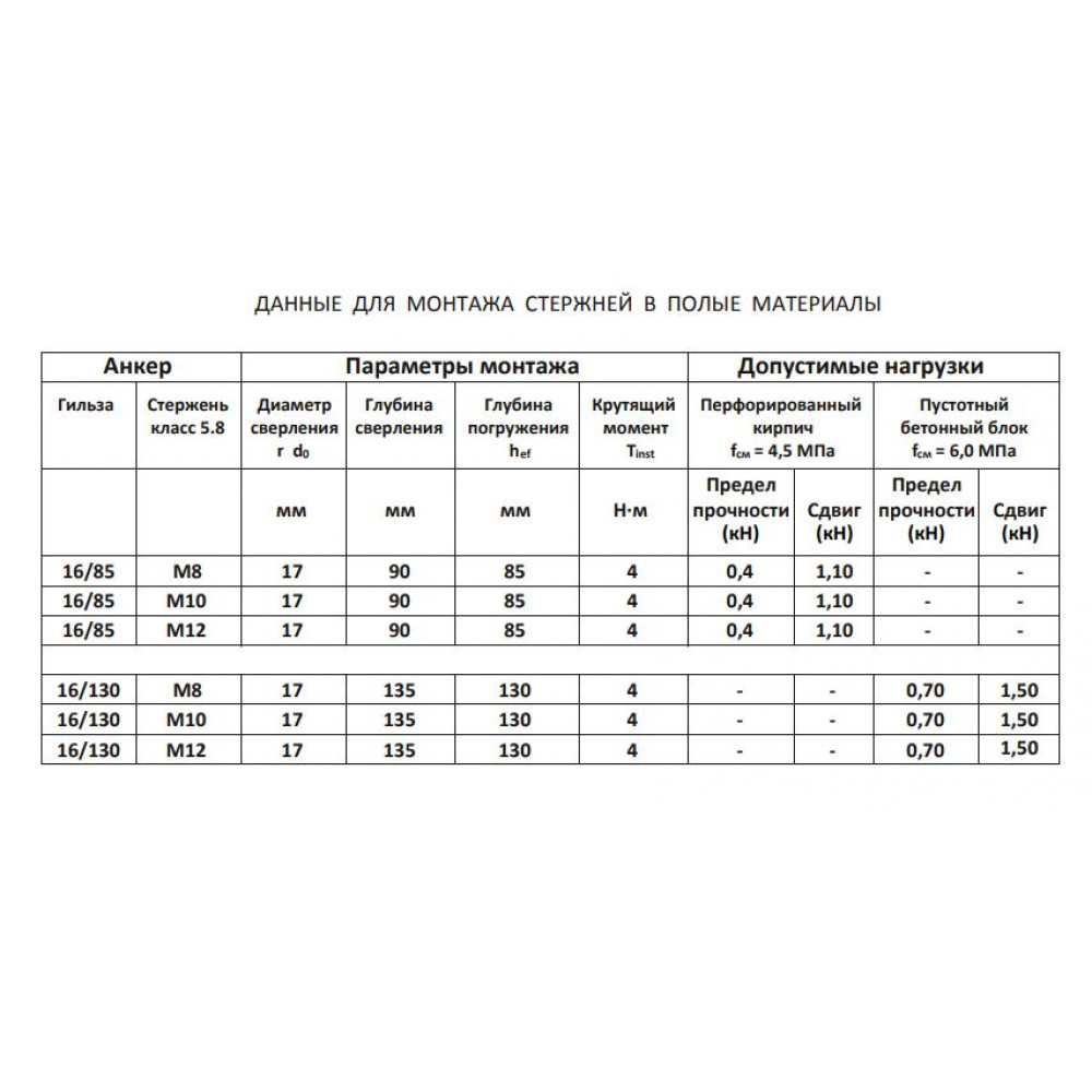 - Если анкер монтируется в пустотелый кирпич, вставьте гильзу подходящих размеров (для кирпича: 16 мм х 85 мм, а для бетонного блока: 16 мм х 130 мм).