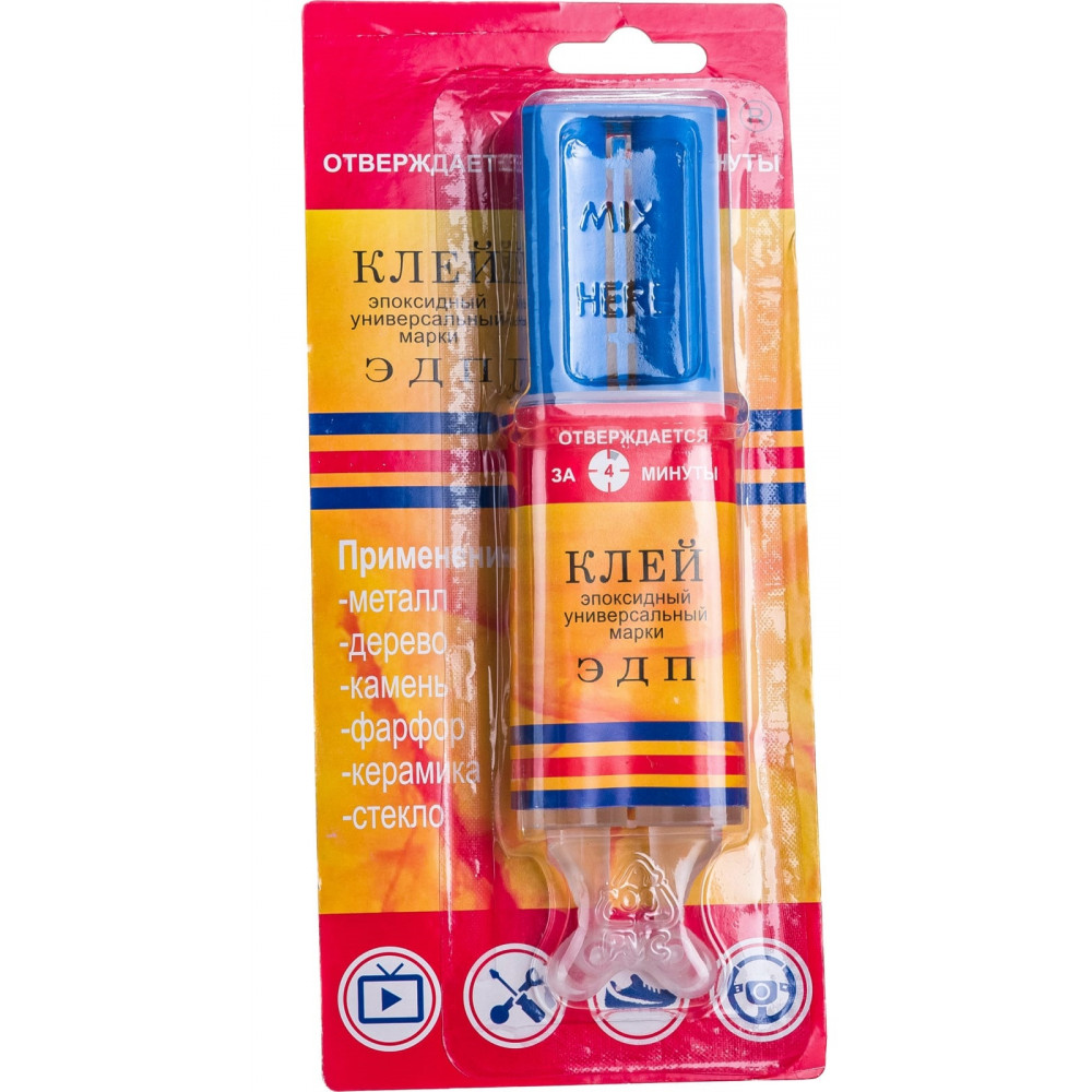 Клей эпоксидный универсальный марки ЭДП в шприце 25 мл. отверждение 4 минуты предназначен для склеивания при температуре от +10°С до +30°С металлов и их сплавов, древесины, керамики, фарфора, стекла, декоративно-облицовочных и других материалов, а также для заделки пор, трещин, раковин при ремонте домашнего инвентаря и автомобилей.