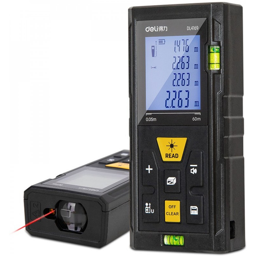 Лазерный дальномер «Дели» DL4169 — высокоточный измерительный прибор для строительных и ремонтных работ. Диапазон измерений: 0,05–60 м, точность — ±3 мм. Оснащён четырёхстрочным дисплеем (1,7 дюйма) с подсветкой, встроенной памятью на 30 измерений. Поддерживает функции расчёта периметра, площади, объёма, «Пифагора», непрерывных измерений, определения минимума/максимума, сложения и вычитания. Автоотключение подсветки через 30 с, полное выключение — через 180 с бездействия.