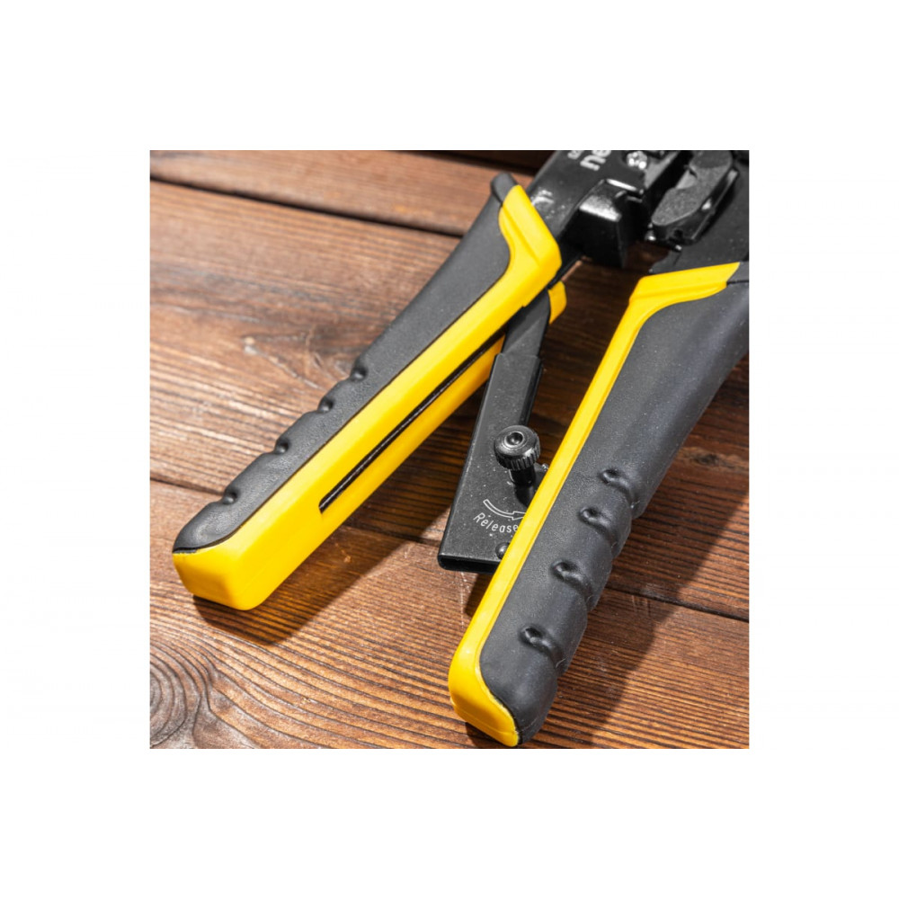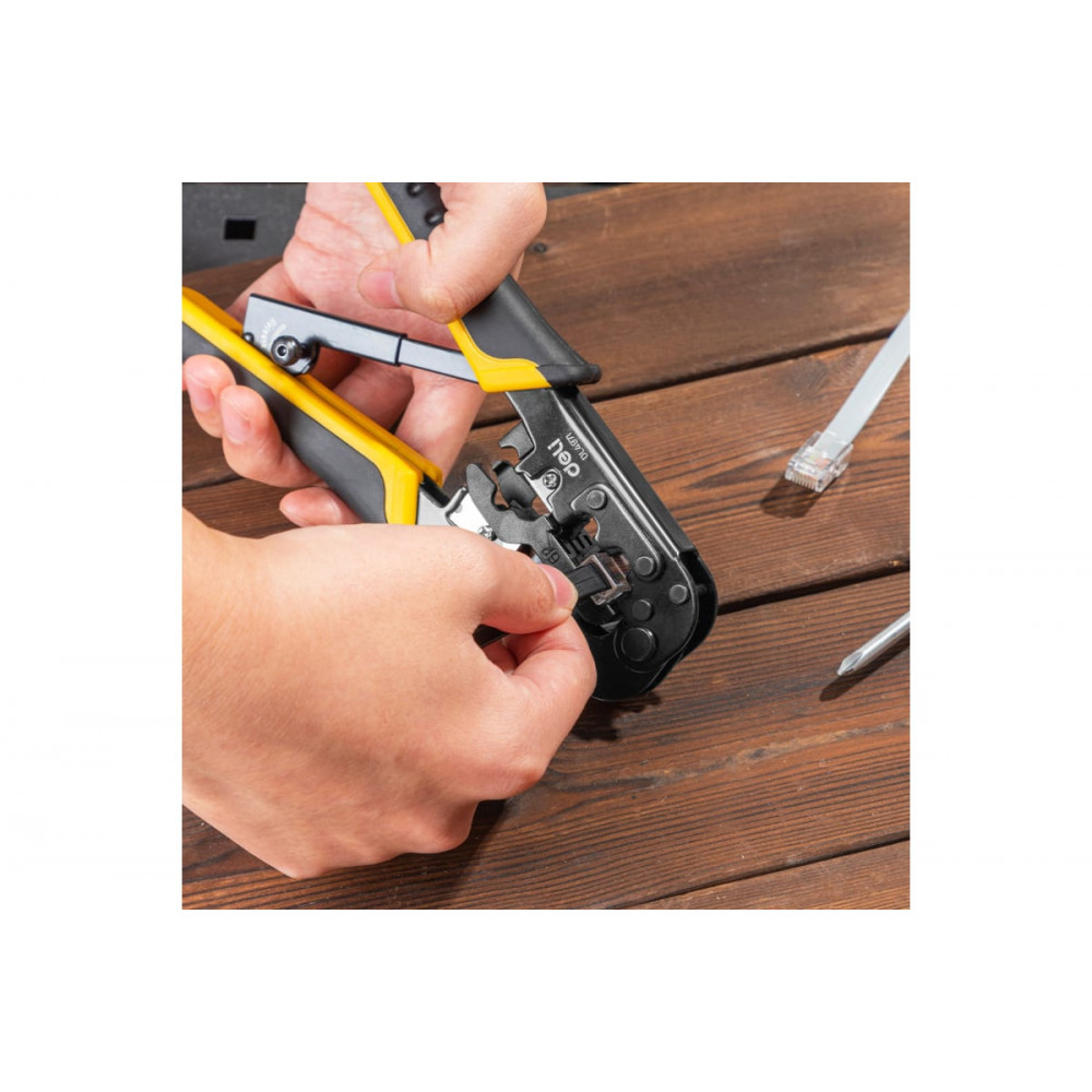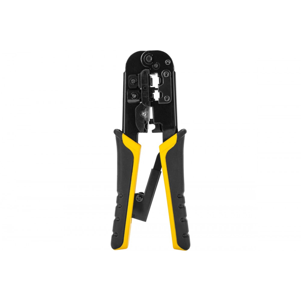 Двухкомпонентная эргономичная ручка с храповиком обеспечивает комфорт и снижает нагрузку на руку при длительной работе. Эти клещи идеально подходят для обжима витой пары UTP/STP и телефонных кабелей 4P/6P/8P, что делает их незаменимыми для профессионалов в области сетевых технологий.