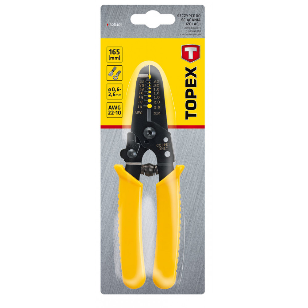 Клещи для зачистки проводов TOPEX длиной 165 мм, для проводов диаметром от 0.6 до 2.6 мм². Предназначены для обжима изоляции. Рукоятки, покрытые антискользящей пластмассой, обеспечивают комфорт во время работы.