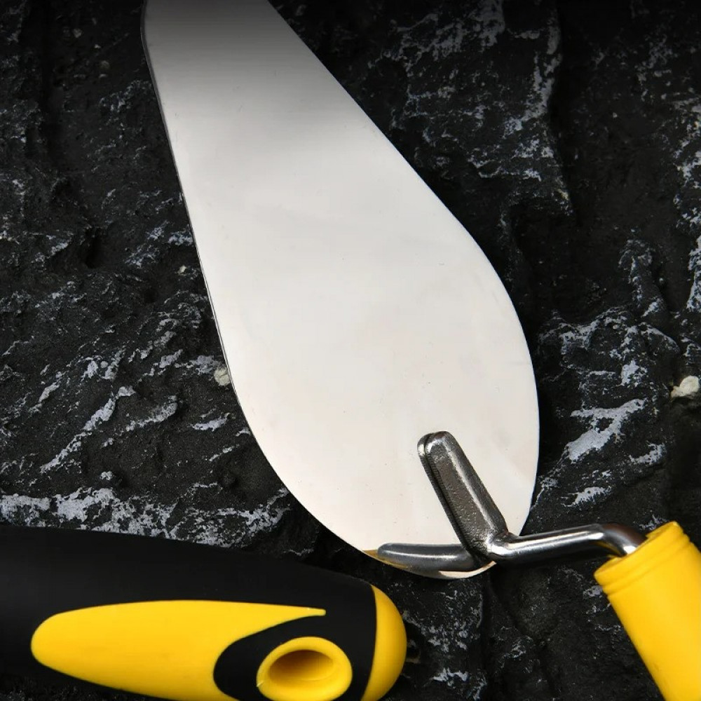 Прорезиненная рукоятка инструмента обеспечивает удобный захват и предотвращает скольжение кельмы в руке. Это делает работу с инструментом комфортной и безопасной.