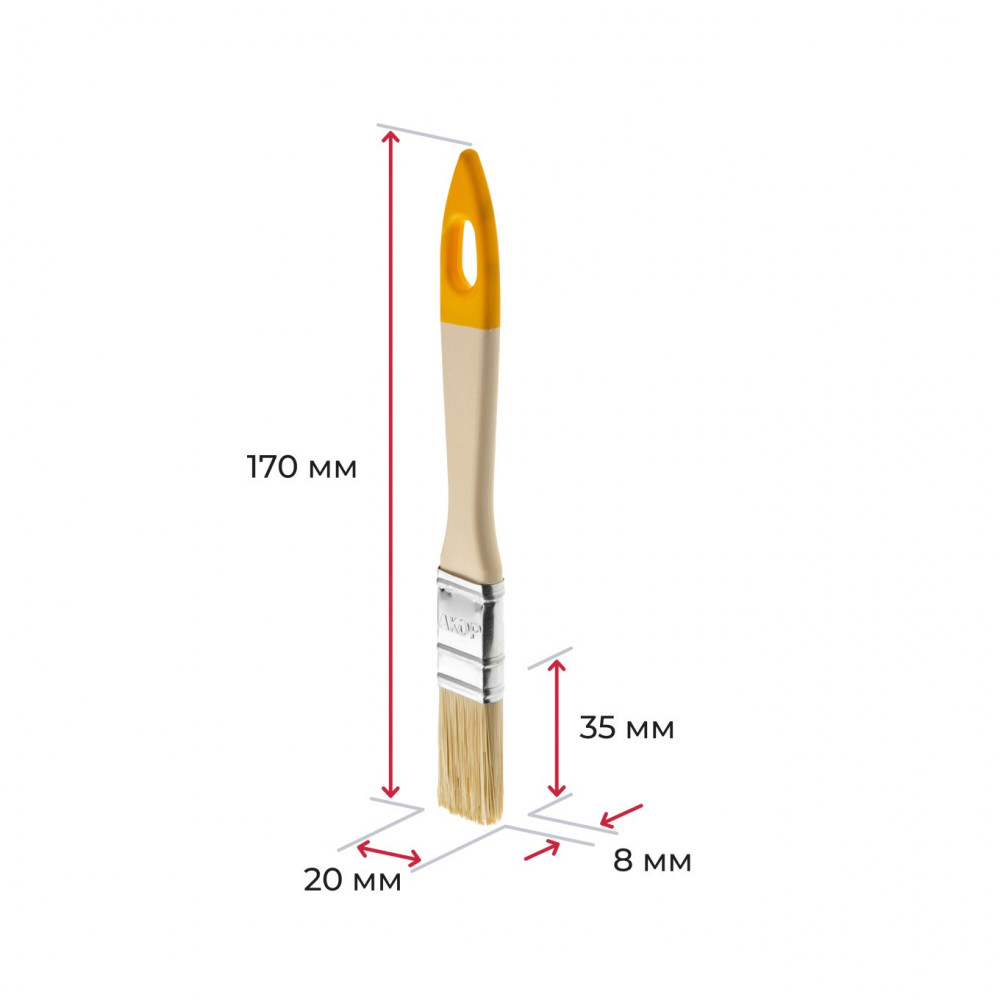 Кисти плоские универсальные «Столичная» (г. Новосибирск). Параметры: ширина щетины 20–100 мм, толщина — 8 мм. Материал щетины — синтетическое волокно, бандаж — жесть, ручка — пластиковая (с отверстием для подвеса).