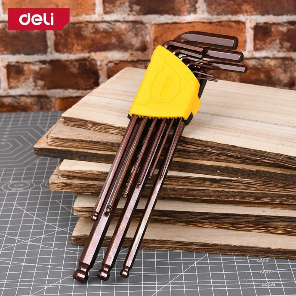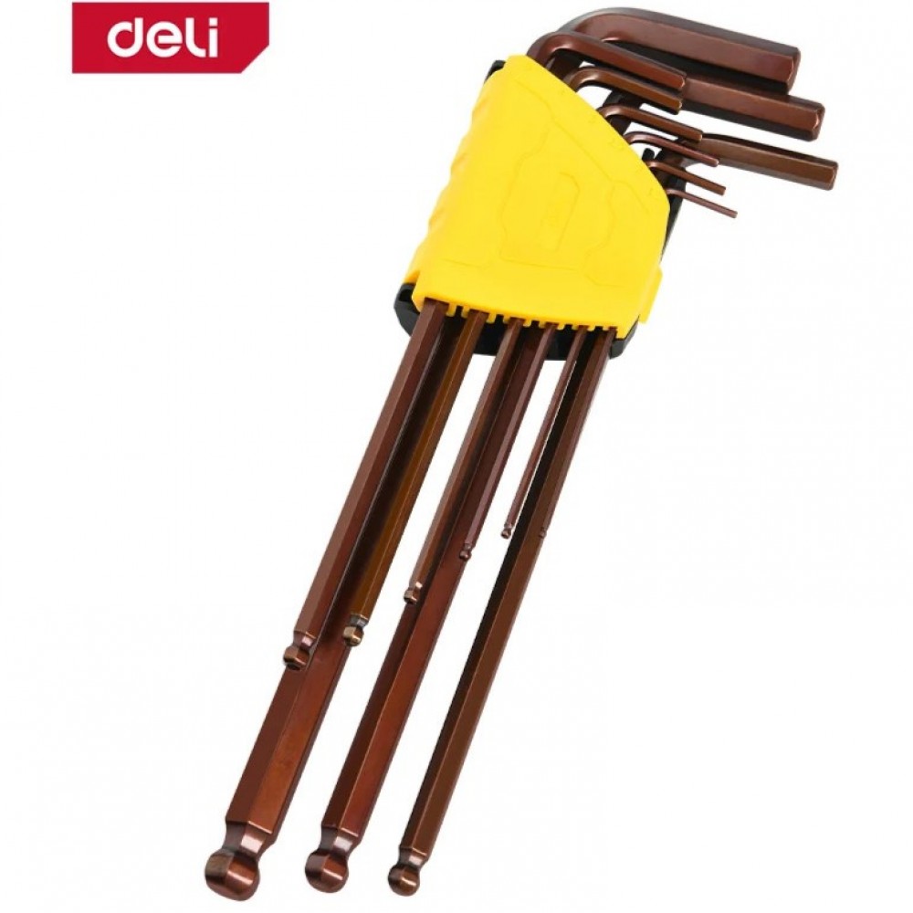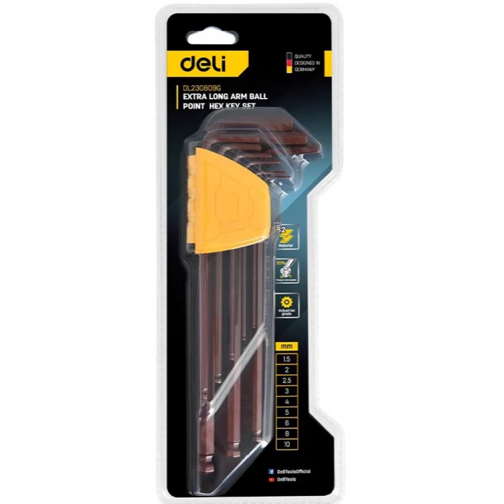 Набор шестигранных ключей Deli DL230809G состоит из 9 сверхдлинных ключей с шаровым наконечником размерами от 1,5 до 10 мм, что позволяет подобрать оптимальный размер для выполнения различных задач.