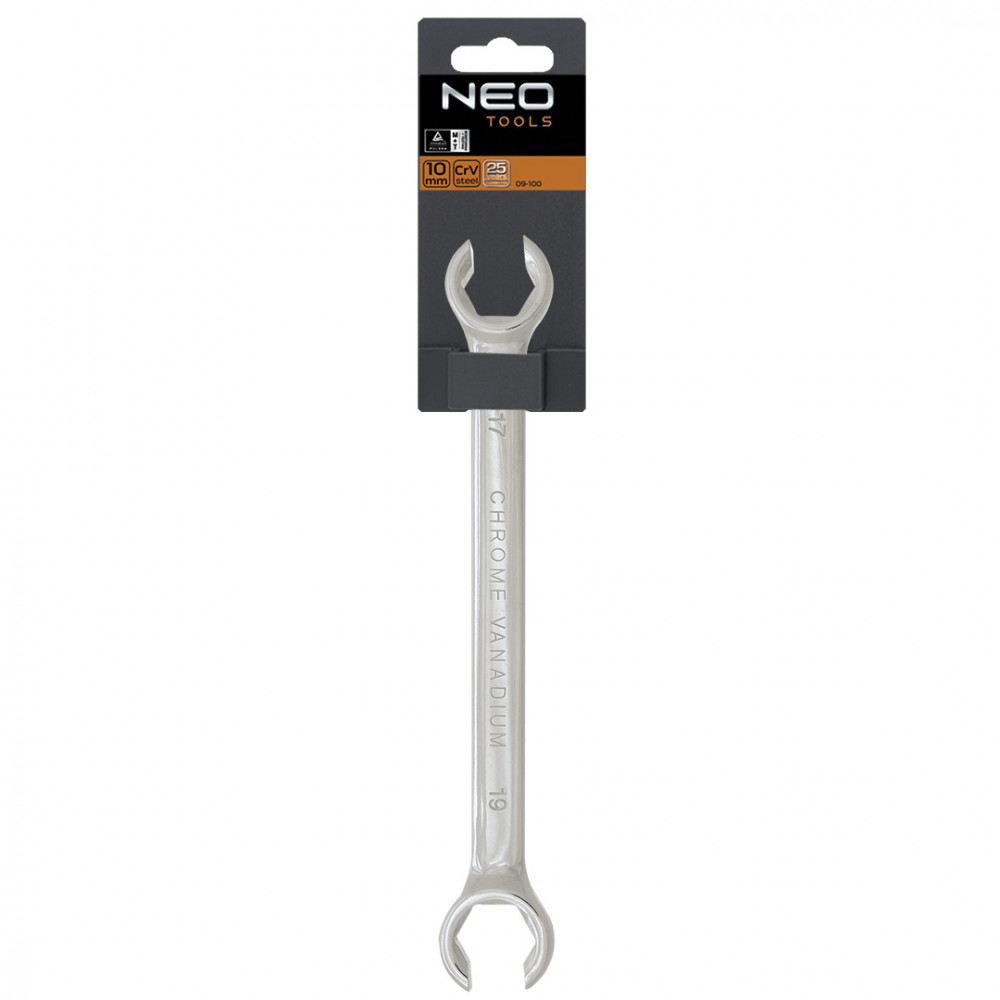 Ключ разрезной двухсторонний NEO используется для обслуживания гидравлических, пневматических и топливных проводов. Изготовлен из высокосортной хромованадиевой стали, отличатся долголетней прочностью. Кольцо, изогнутое под углом 15°, облегчает работу в труднодоступных местах. Качество инструмента подтверждено сертификатом TÜV и 25-летней гарантией производителя.