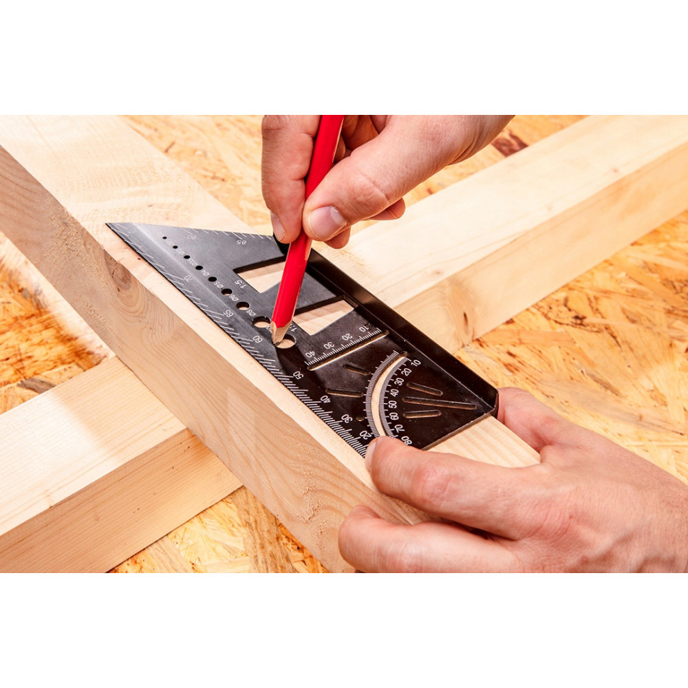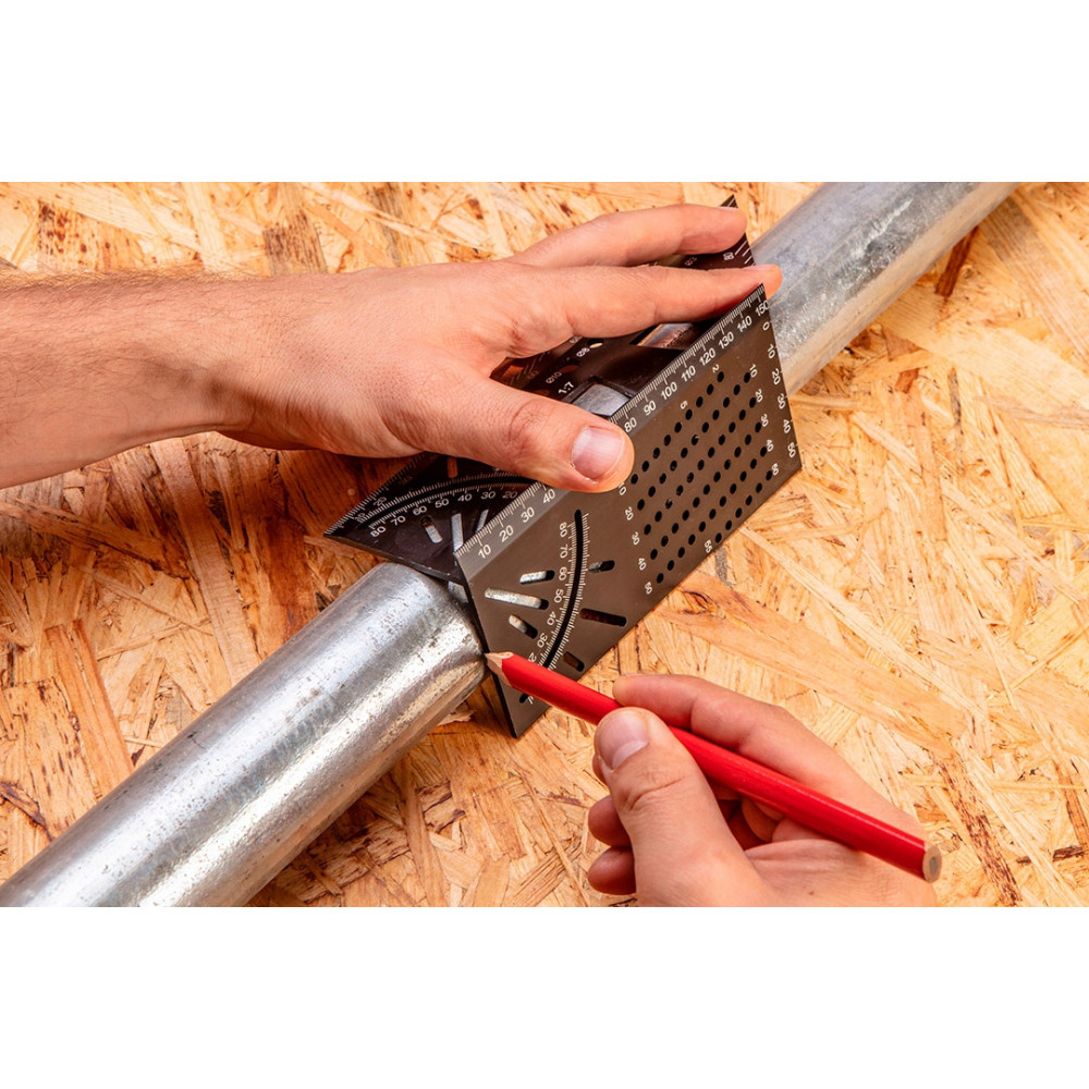 Угольник NEO 3D, японский, алюминиевый 72-115 позволяет работать с 3D материалами, такими как деревянные балки, трубы. Оснащен ограничителями углов 45° и 90°. Кроме того, угольник оборудован специальным сверлильным механизмом, благодаря которому определяется диаметр сверла. За счет своей формы обеспечивает точную разметку параллельных линий, перенос диагональных углов. Оснащен простыми измерительными шкалами, шкалами измерения углов, отверстиями для измерения диаметра сверла.