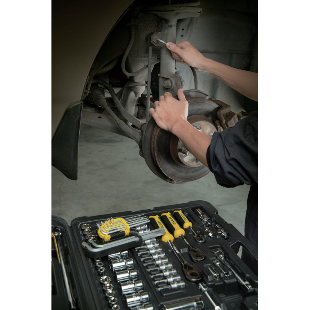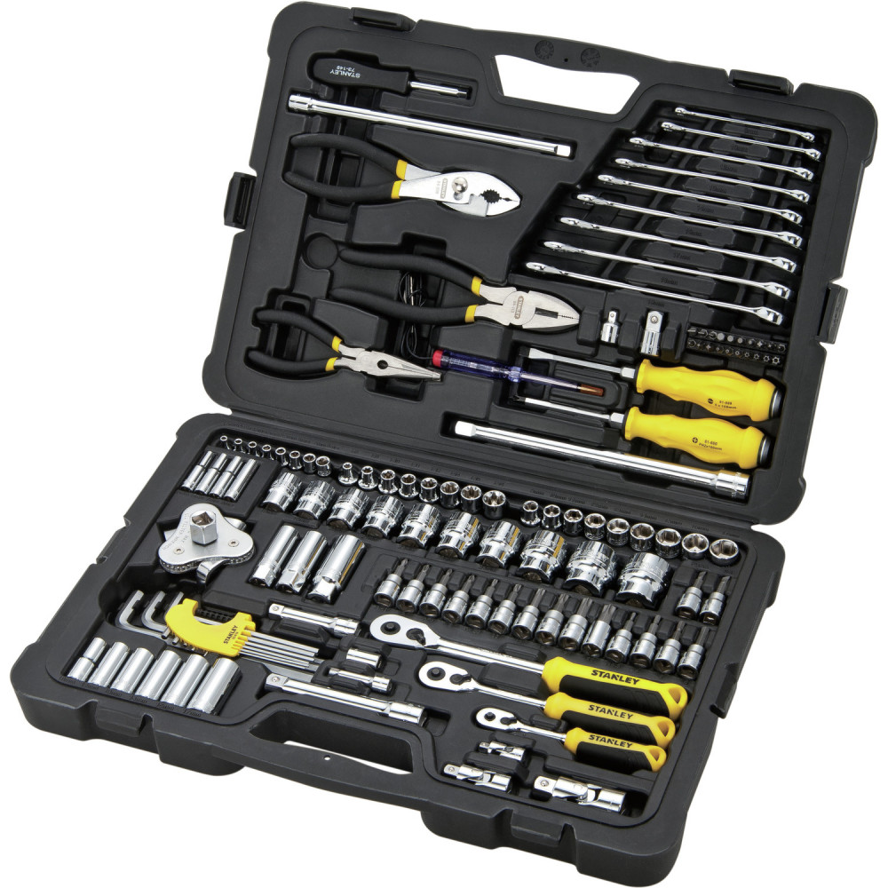 Набор STANLEY STMT74393-8 представляет собой большой универсальный набор инструментов. Тщательно отобранные инструменты, собраны в один большой комплект (125 предметов) и помещены в практичный пластиковый кейс со стальным каркасом. Все рабочие части инструментов изготовлены из долговечной и надежной инструментальной хромванадиевой стали. Удобные эргономичные рукоятки обеспечивают надежный хват и комфорт во время работы. Инструменты покрыты хромированным слоем для дополнительной защиты от коррозии. Размер посадочного квадрата,": 1/2, 1/4, 3/8.