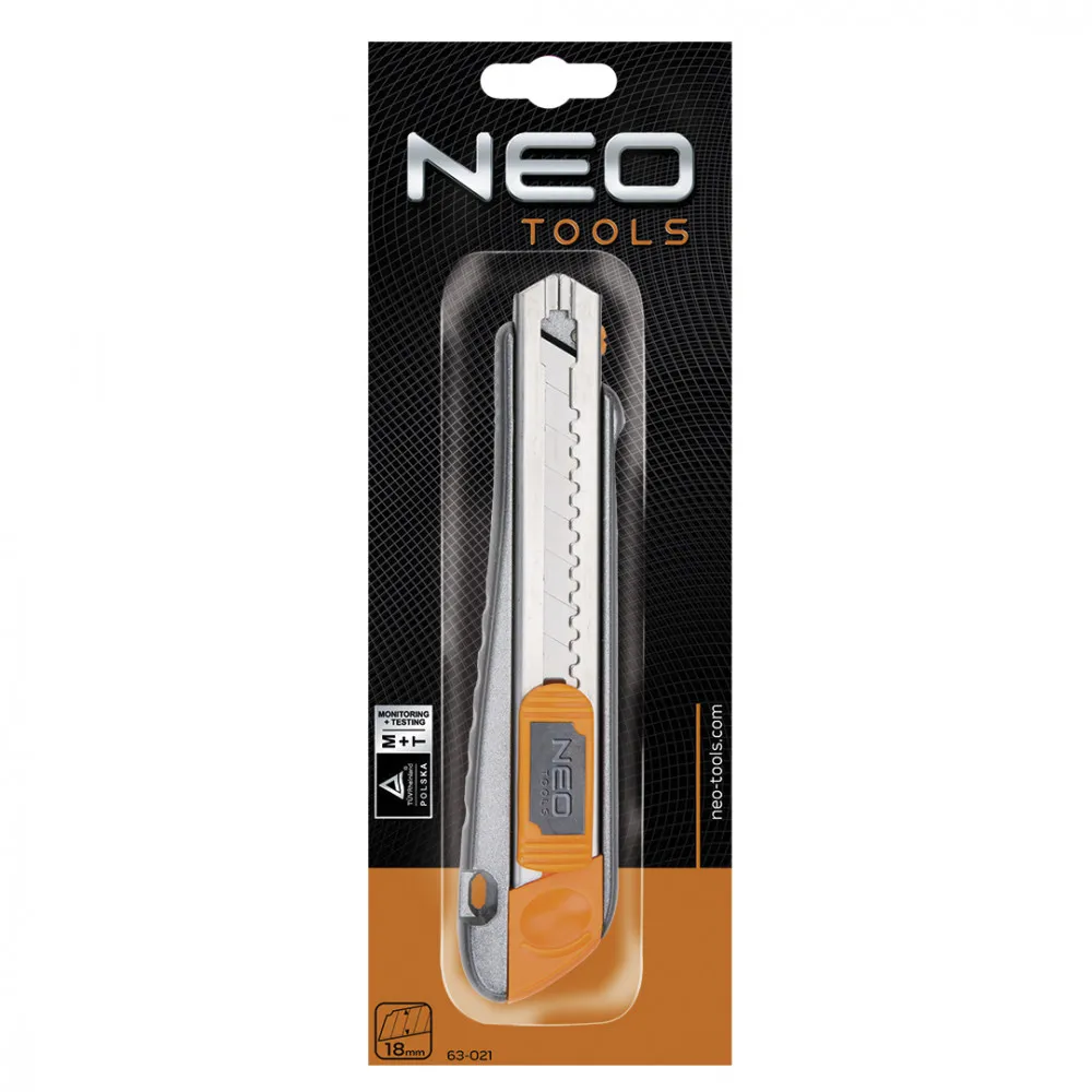 Нож с отламывающимся лезвием 63-021 от польского бренда NEO для работы с лезвиями шириной 18 мм. Благодаря металлической конструкции корпуса обеспечивается долгий срок службы инструмента и большая сила резки. Так же имеется дробилка использованного лезвия, которая делает процесс работы более результативным. Удобство и безопасность во время эксплуатации обеспечивает эргономичная форма рукоятки. Качество изделия подтверждено сертификатом TÜV Rheinland. Бренд NEO зарекомендовал себя как надежный и качественный производитель инструментов, учитывающий пожелания профессионалов.
