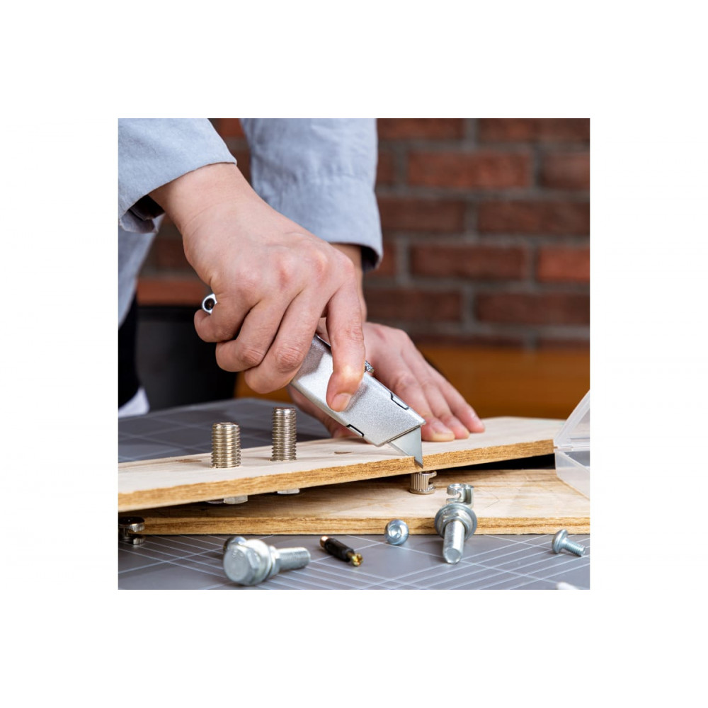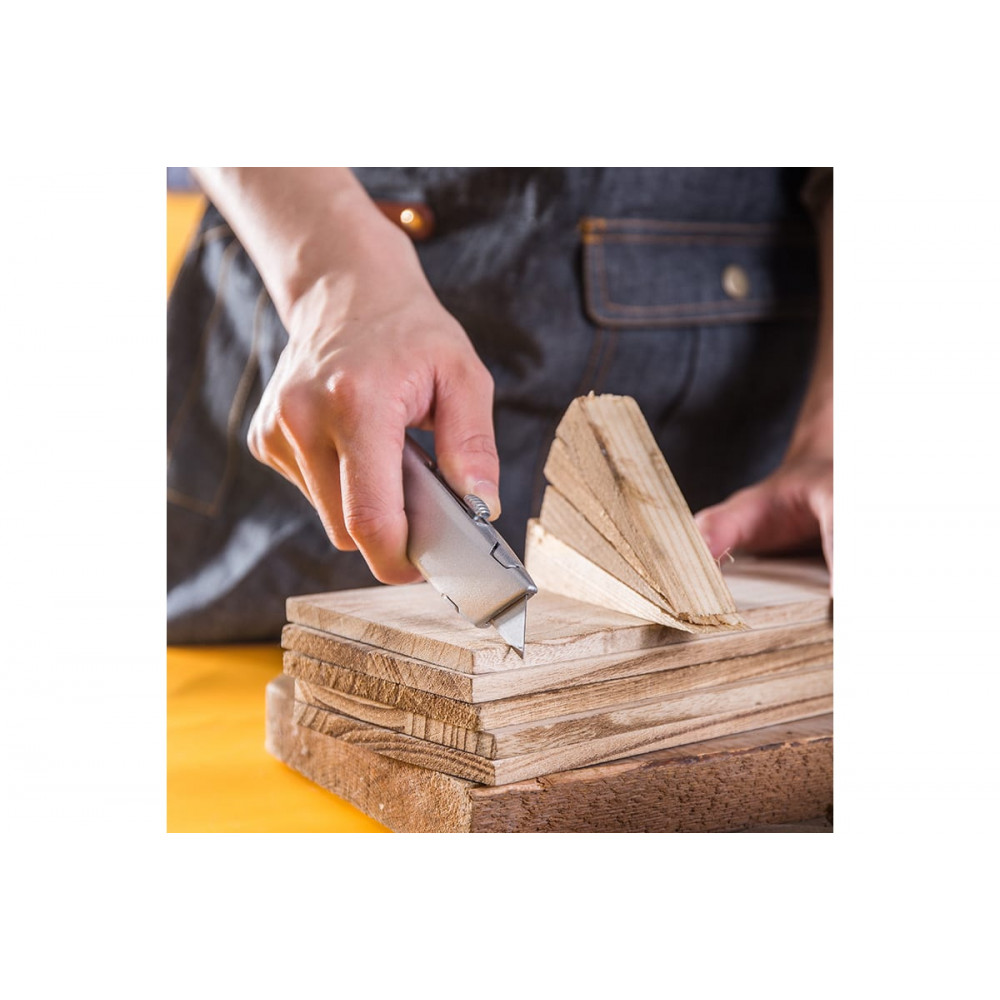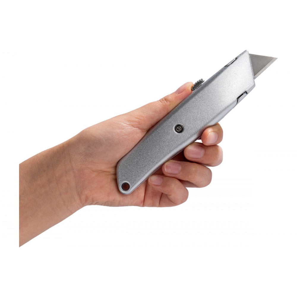 Функция автоматической блокировки лезвия обеспечивает безопасность при использовании. Лезвие может быть зафиксировано в трех различных положениях для удобства работы. Внутри ножа хранятся дополнительные лезвия, всего в комплекте их три.