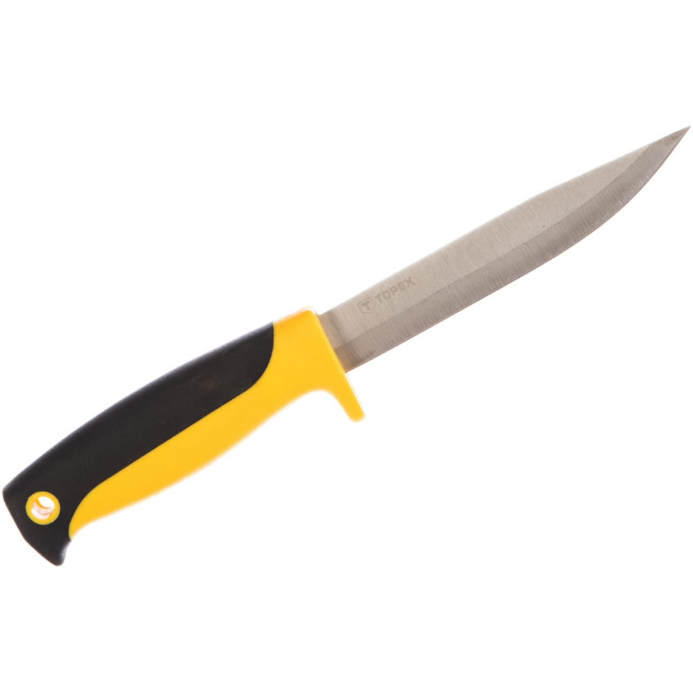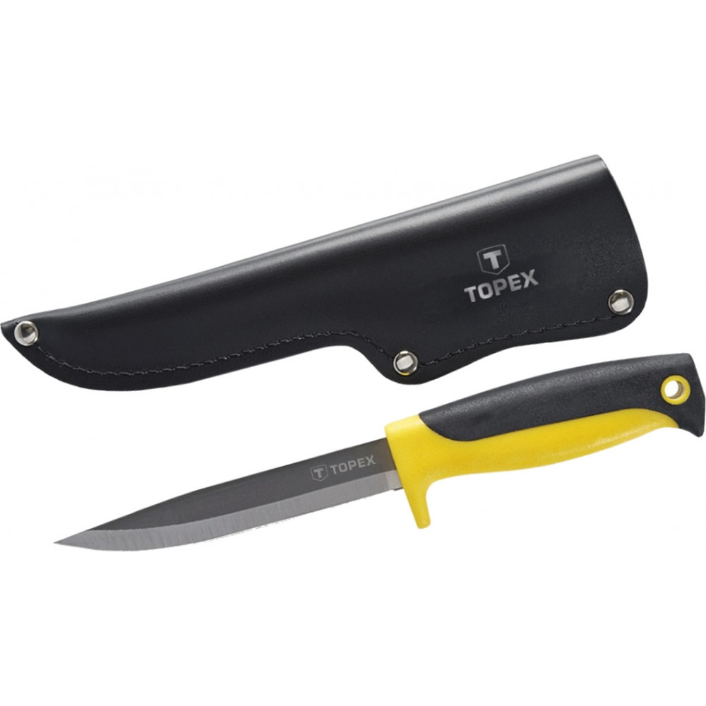 Нож универсальный TOPEX с длиной лезвия 120 мм. Лезвие изготовлено из высококачественной нержавеющей стали, что гарантирует долгий срок службы инструмента. Эргономичная пластмассовая рукоятка, покрытая антискользящим материалом, обеспечивает комфорт и безопасность во время работы. Кожаная кобура облегчает хранение и транспорт.