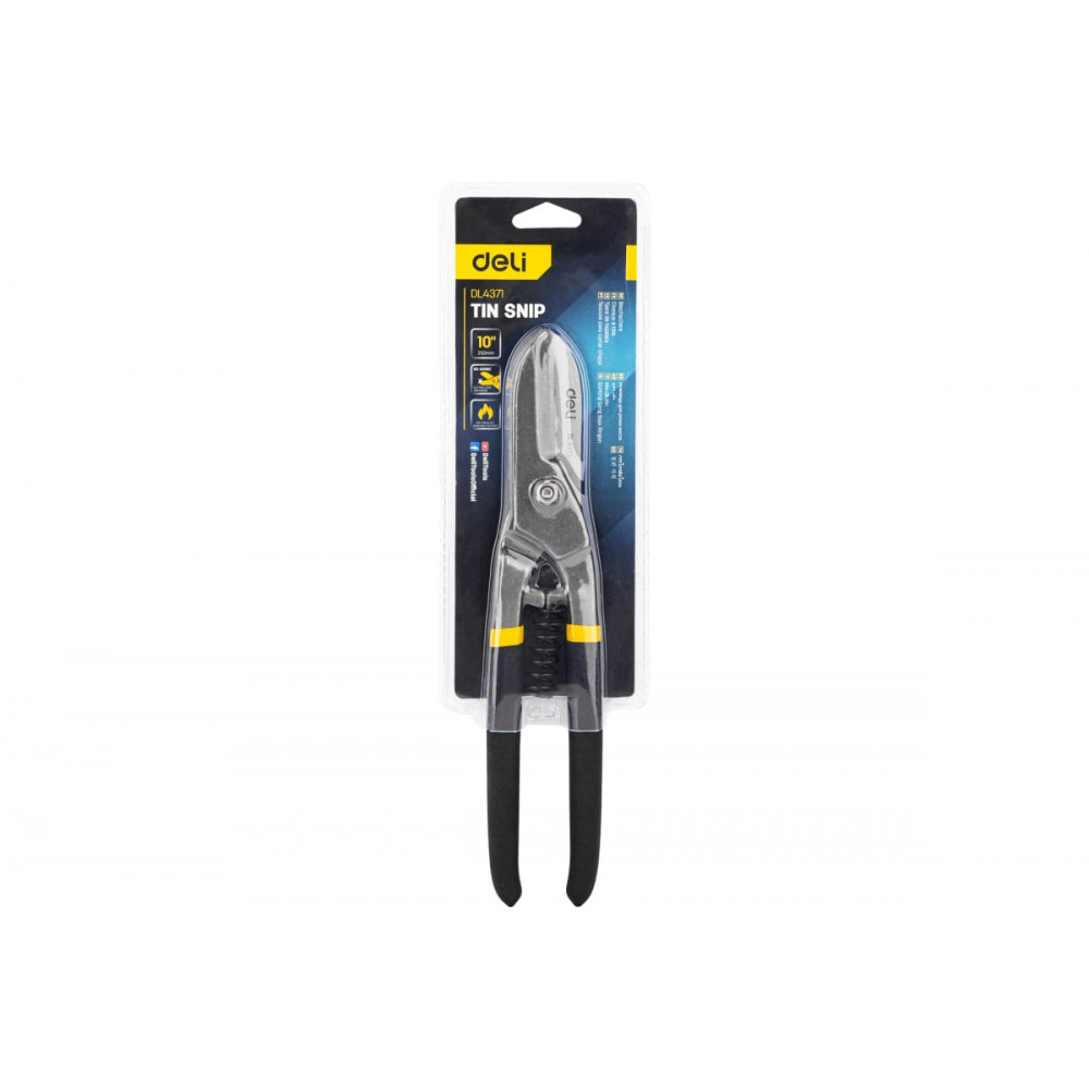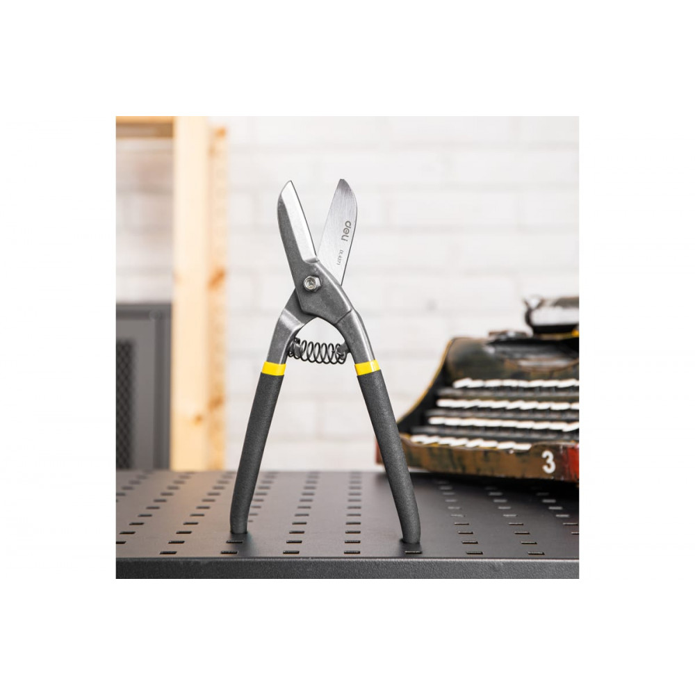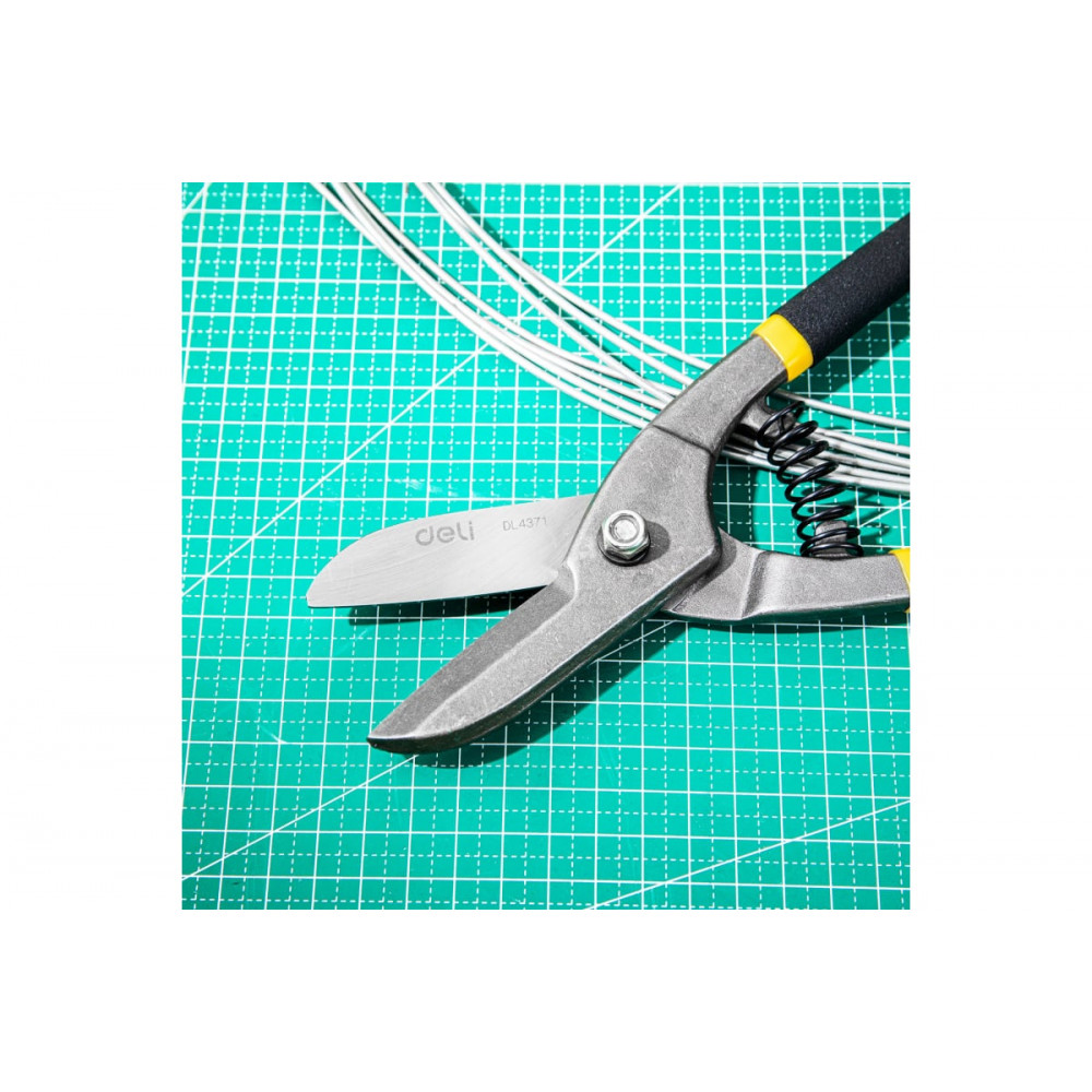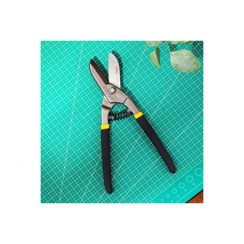 Ножницы DL4371 по металлу прямые 250мм, Deli применяются для разрезания металлических листов в ходе различных мероприятий. Устройство создано из высококачественной легированной стали прочностью 50-55 HRC. Хромированное покрытие обеспечивает надежную защиту от коррозии.