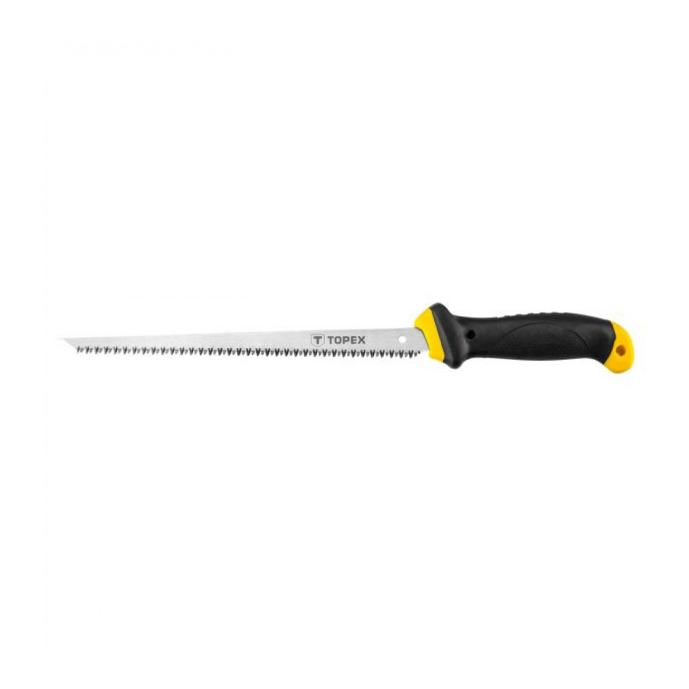 Ножовка по гипсокартону TOPEX 10A719 длина полотна 250 мм. Предназначена для вырезки отверстий в гипсокартонных плитах. Ножовочное полотно, изготовленное из высококачественной закаленной стали, гарантирует долгий срок службы инструмента. Двухсторонняя заточка зубьев снижает сопротивление резанию. Эргономичная пластмассовая ручка обеспечивает прецизионное ведение, а антискользящее покрытие улучшает захват и гарантирует высокий комфорт работы.