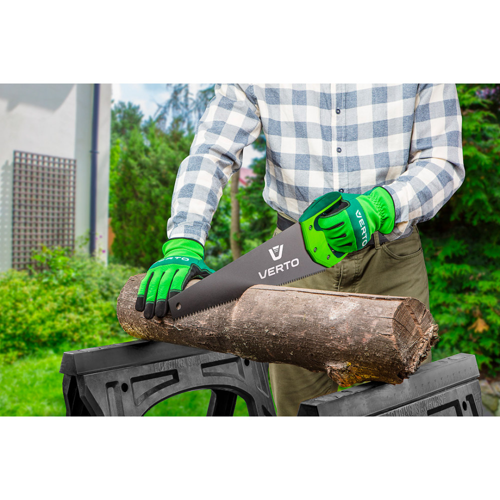 Ножовка VERTO 15G102, длина 450 мм. Трехсторонняя заточка и закалка зубьев значительно уменьшают сопротивление резанию, а полотно с PTFE-покрытием облегчает продольное распиливание древесины. Специальный шаг 7 зубьев на дюйм ускоряет работу. Эргономичная двухкомпонентная ручка обеспечивает прецизионное ведение, а благодаря антискользящему покрытию она не выскальзывает из руки, и, тем самым, гарантирует высокий комфорт работы. К ножовке прилагается прочный текстильный чехол, которые защищает зубья, а также облегчает транспортировку и хранение инструмента.