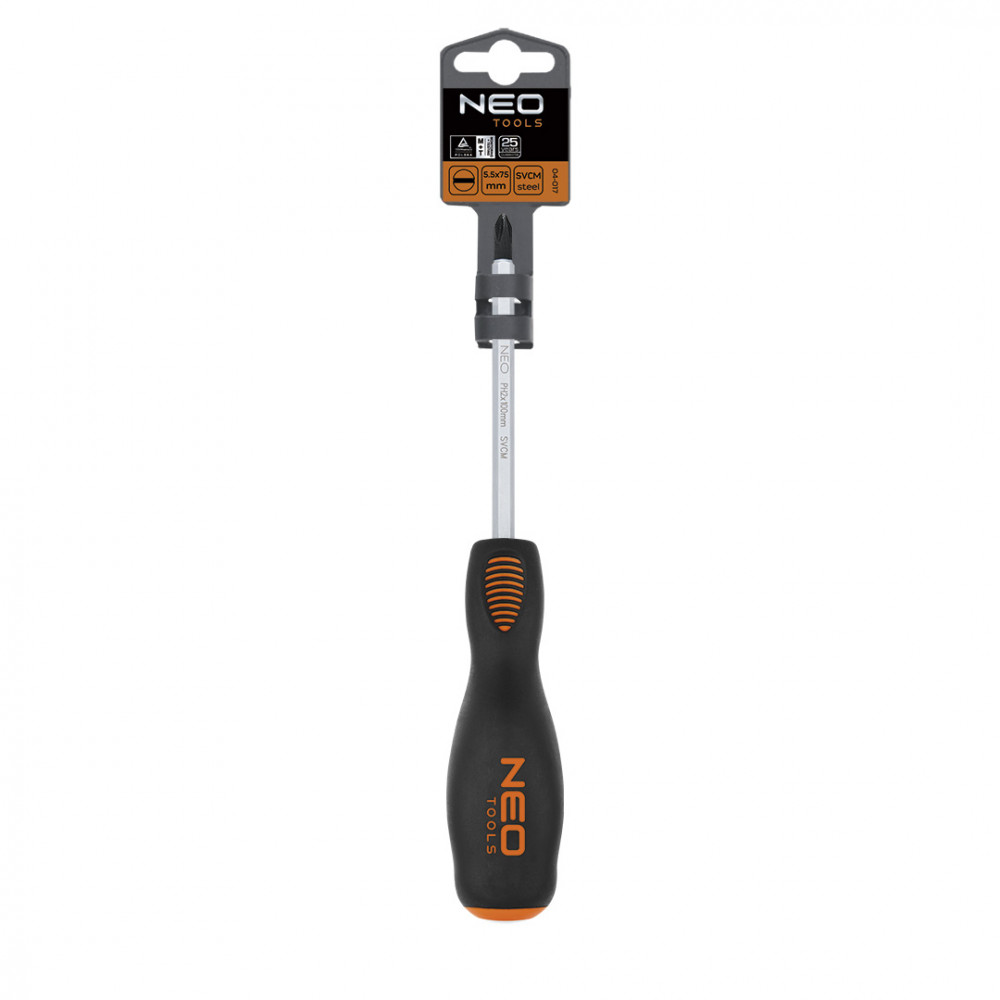 Отвертка крестовая для подбивания 04-027 от NEO. Рабочая часть изделия подвергнута термообработке, за счет чего достигнута нужная твердость и стойкость к изгибу 56 HRC. Специально усиленный стержень отвертки изготовлен из чрезвычайно прочной хромомолибденовой стали, что говорит о его прочности и долговечности.
