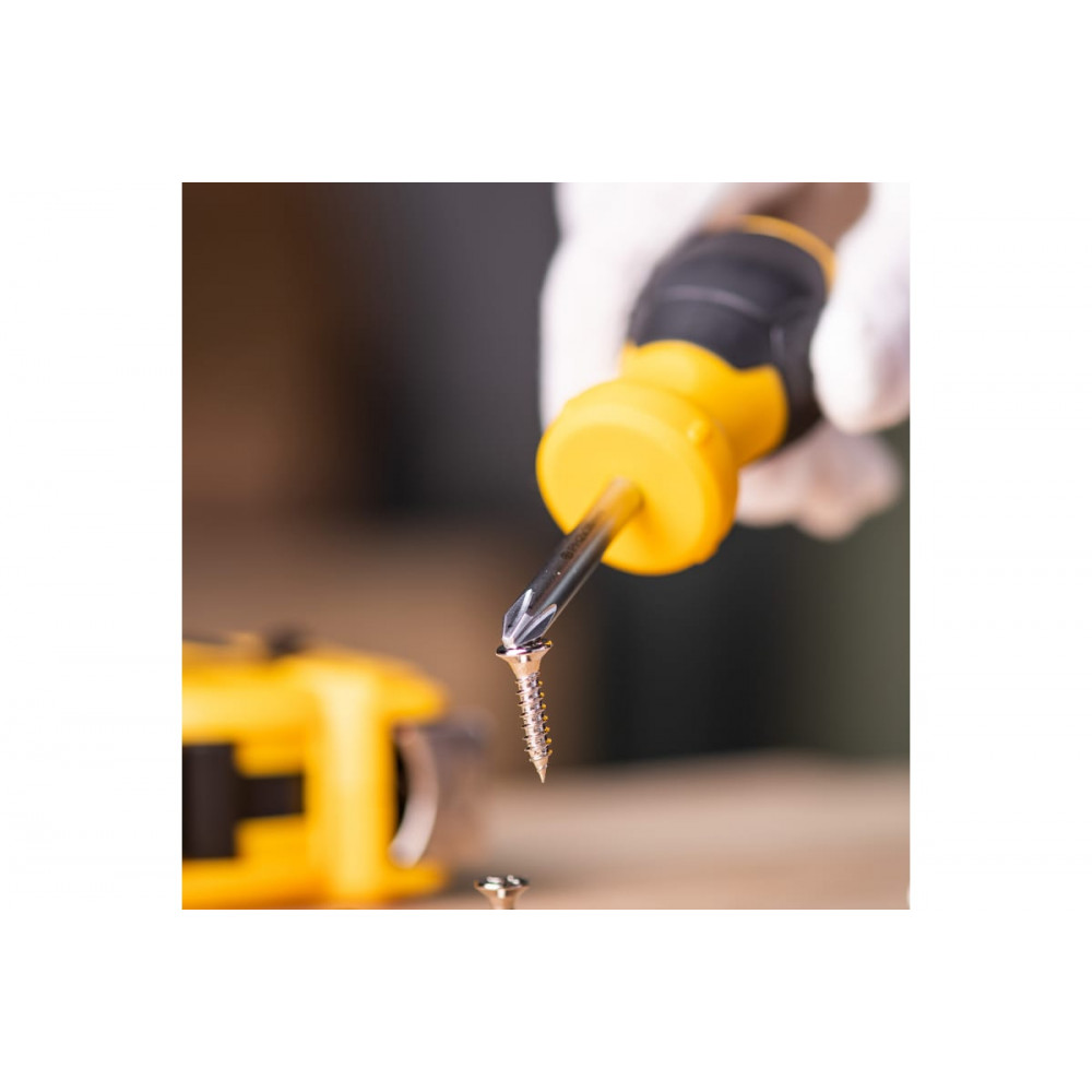 Изготовлена из высококачественной хромованадиевой стали со стойким матовым покрытием для повышения прочности и долговечности инструмента. Хвостовик усилен с помощью закаленного магнитного сердечника с твердостью до 57 HRC, что повышает надежность удержания винтов при установке и демонтаже.
