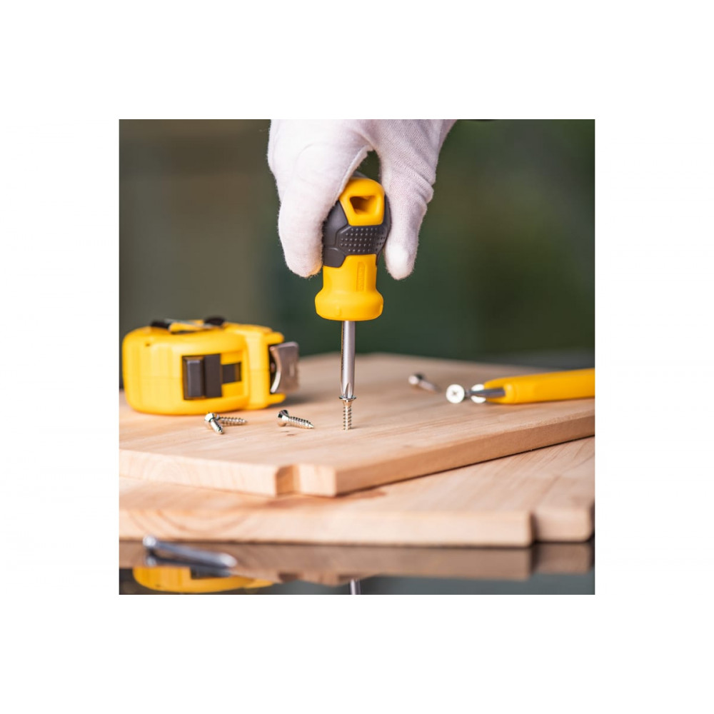 Рукоятка двухкомпонентного типа из TPR и PP с антискользящим эффектом обеспечивает надежное и комфортное удержание инструмента в руке. Отверстие в ручке предназначено для удобного хранения на подвесе, а рельефные элементы на поверхности препятствуют скатыванию отвертки с наклонных поверхностей.