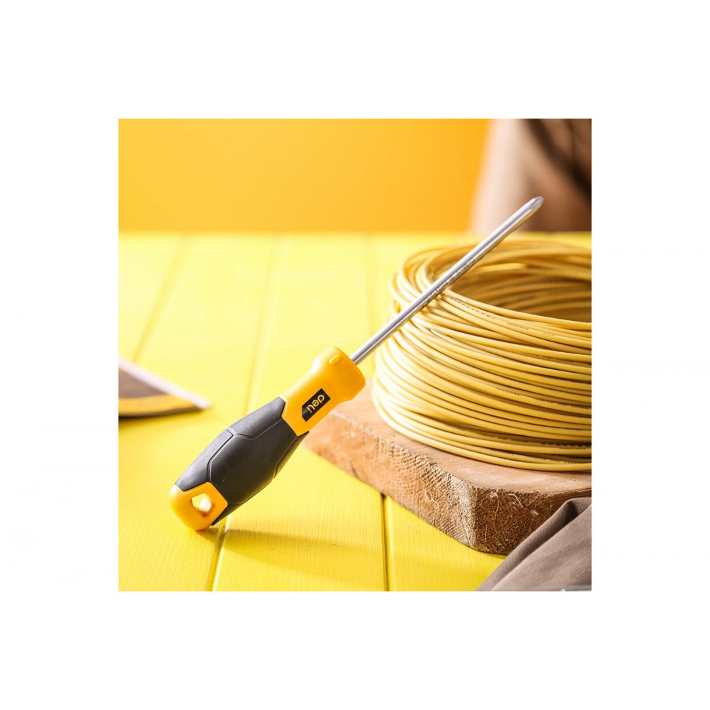 Рукоятка двухкомпонентного типа из TPR и PP с антискользящим эффектом обеспечивает надежное и комфортное удержание инструмента в руке. Отверстие в ручке предназначено для удобного хранения на подвесе, а рельефные элементы на поверхности препятствуют скатыванию отвертки с наклонных поверхностей.