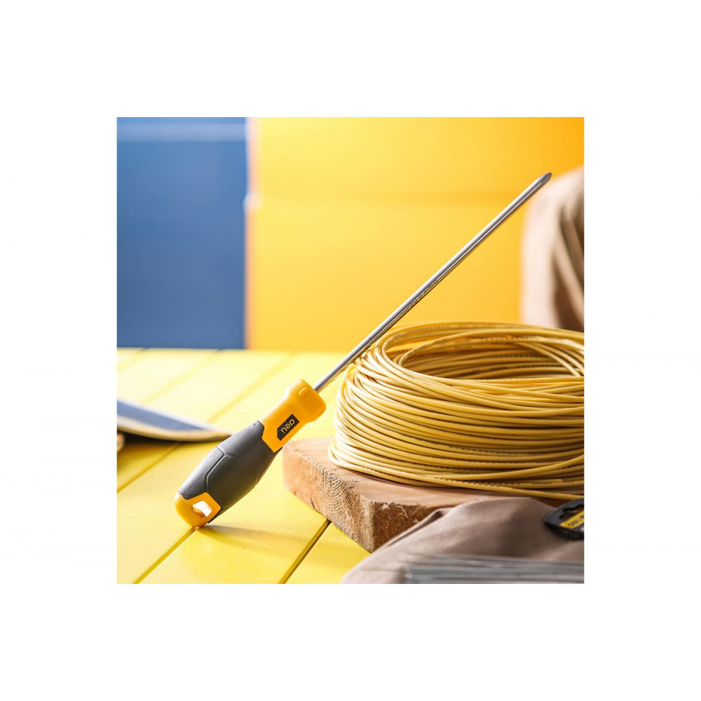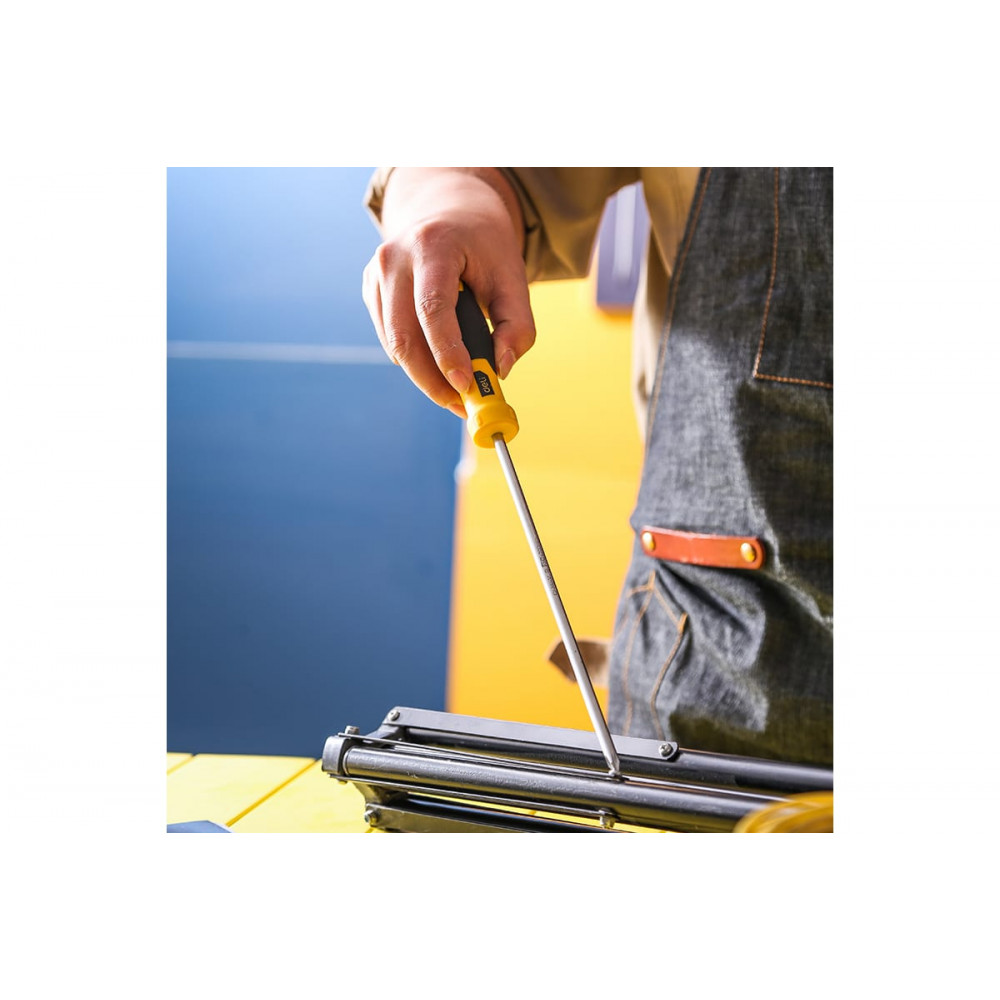 Рукоятка двухкомпонентного типа из TPR и PP с антискользящим эффектом обеспечивает надежное и комфортное удержание инструмента в руке. Отверстие в ручке предназначено для удобного хранения на подвесе, а рельефные элементы на поверхности препятствуют скатыванию отвертки с наклонных поверхностей.