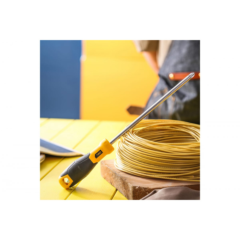 Рукоятка двухкомпонентного типа из TPR и PP с антискользящим эффектом обеспечивает надежное и комфортное удержание инструмента в руке. Отверстие в ручке предназначено для удобного хранения на подвесе, а рельефные элементы на поверхности препятствуют скатыванию отвертки с наклонных поверхностей.