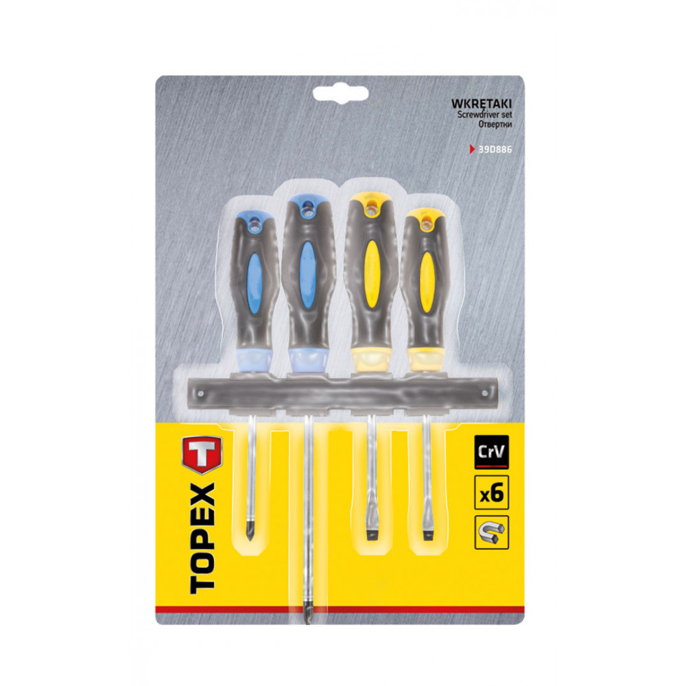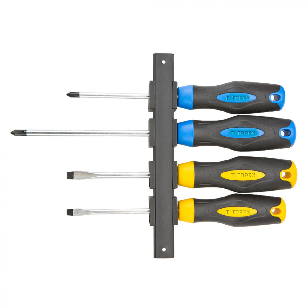 Набор отверток TOPEX предназначен для выполнения механических работ, а также работ, выполняемых мастерами-любителями. Стержень каждой из четырех отверток изготовлен из прочной хромомолибденовой стали, обеспечивающей долгий срок службы инструмента. Магнитное жало из закаленной стали облегчает работу с инструментом. Эргономичная пластмассовая рукоятка, покрытая антискользящим материалом, обеспечивает комфорт и безопасность во время работы.