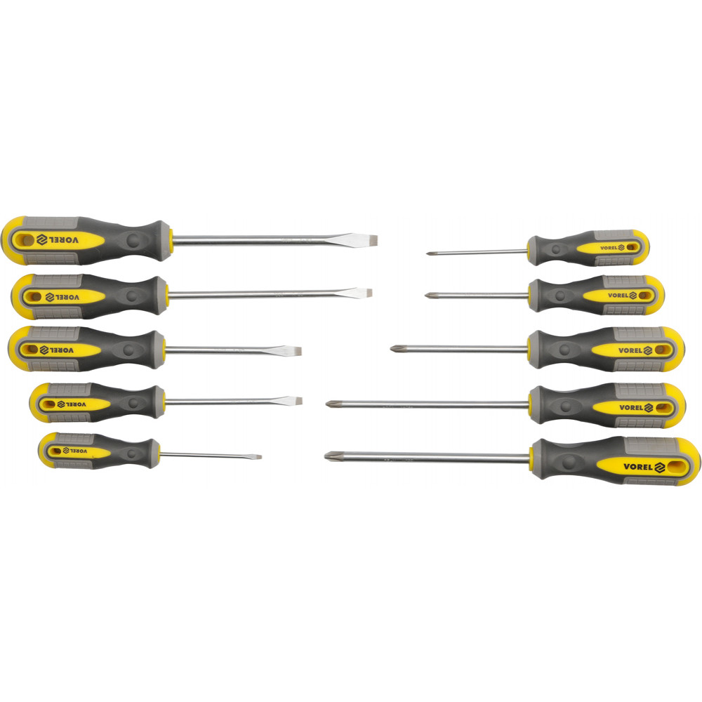 Набор 60970 от VOREL включает в себя 10 плоских и крестовых отверток, которые отлично подойдут как для профессионального использования, так и в быту.