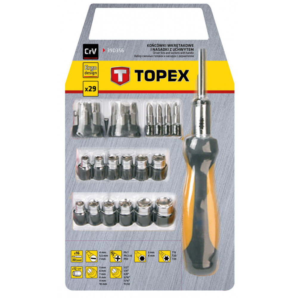 Набор сменных наконечников и головок TOPEX состоит из 29 предметов с органайзерами для сменных головок и наконечников. Весь инструмент изготовлен из высококачественной хромованадиевой стали, обеспечивающей долгий срок службы инструмента.