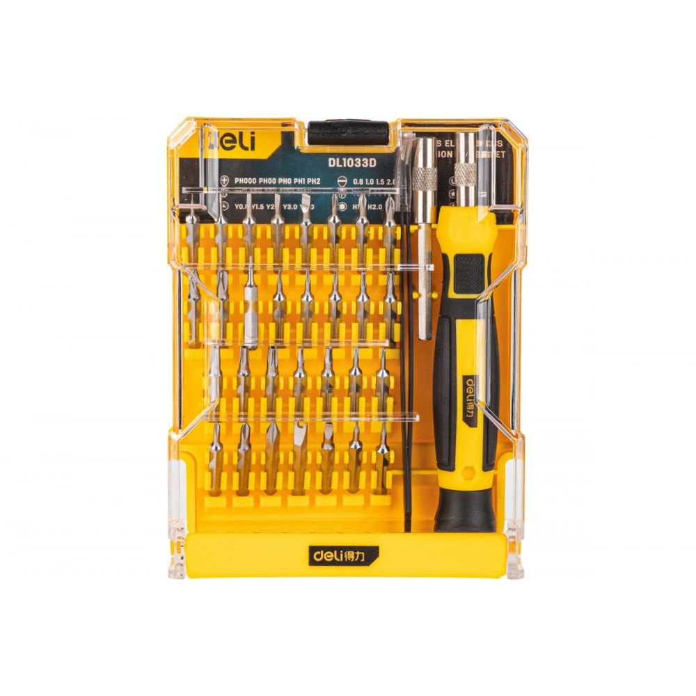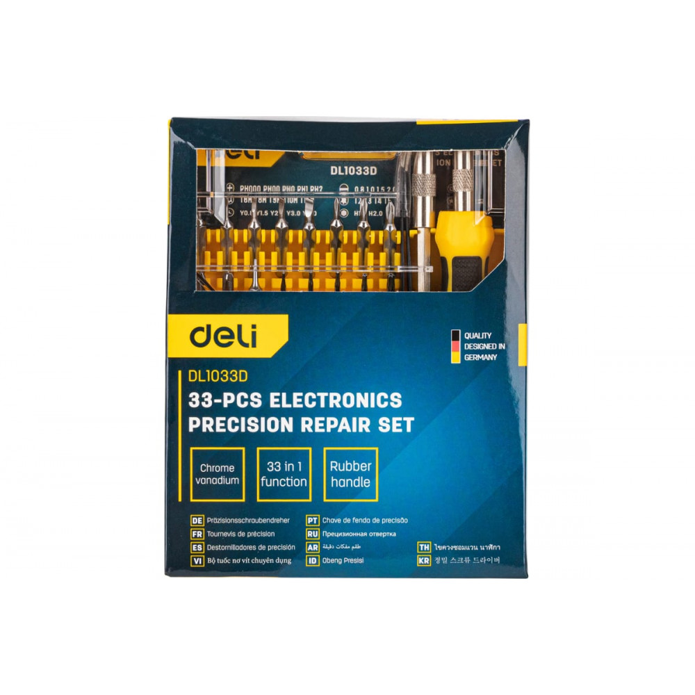 Набор DL1033D прецизионных отверток с пинцетом, Deli - это высококачественный набор прецизионных отверток, который включает в себя 33 различных инструмента, включая пинцет. Каждый инструмент выполнен из высококачественной стали и имеет точную форму и размер, что обеспечивает удобство и точность при работе с различными деталями и механизмами.