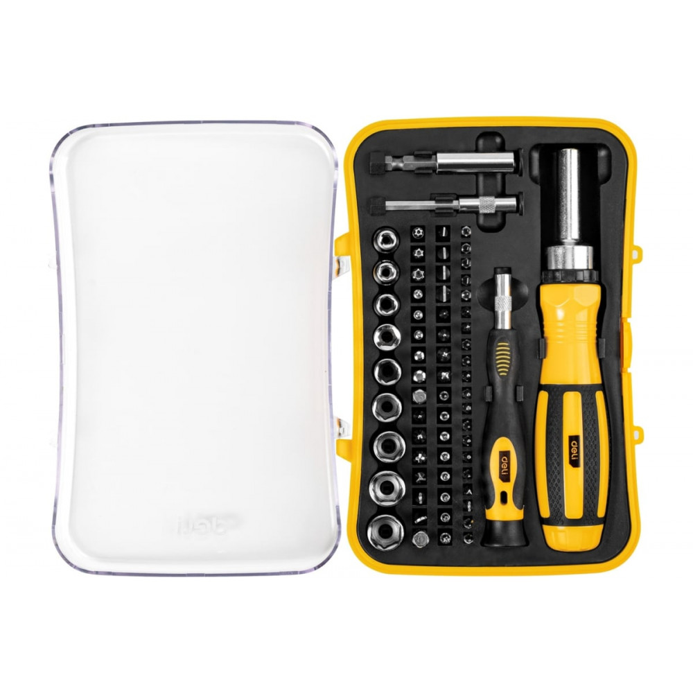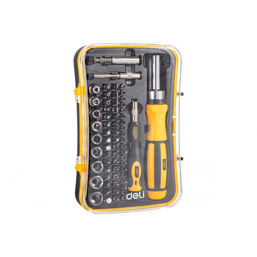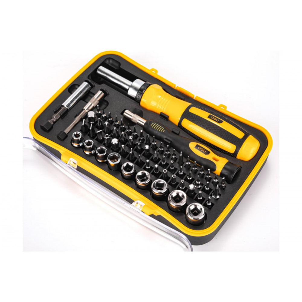 Набор DL3565 прецизионных отверток, 65 предметов Deli представляет собой набор из 65 прецизионных отверток и бит, которые можно использовать для работы с различными видами крепежа. В комплект входят отвертки разного размера, биты для работы с разными размерами головок, а также держатель для хранения всех инструментов в одном месте.