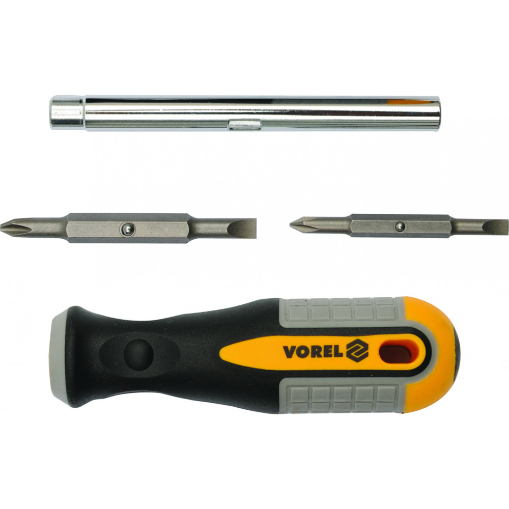 Отвертка 64654 от VOREL представляет собой универсальное ручное приспособление с шестью функциями, которое можно эффективно применять в процессе установки или снятия различных видов крепежа с крестовым или прямым шлицем.