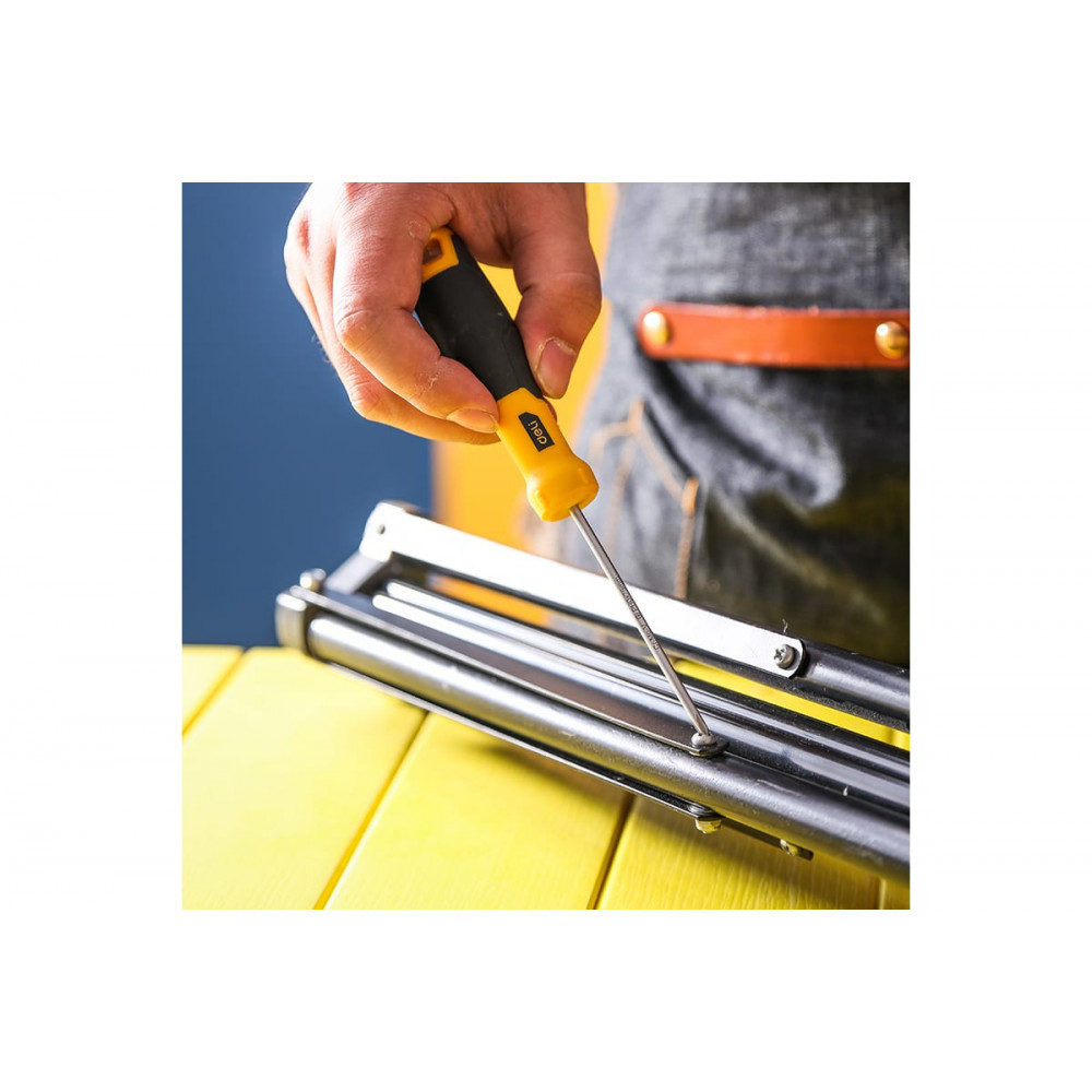 Отвёртка изготовлена из высококачественной хромванадиевой стали (CR-V), которая обеспечивает высокую прочность и устойчивость к коррозии. Кроме того, рукоятка отвёртки выполнена из пластика ABS, что обеспечивает удобный захват и предотвращает скольжение в руке.