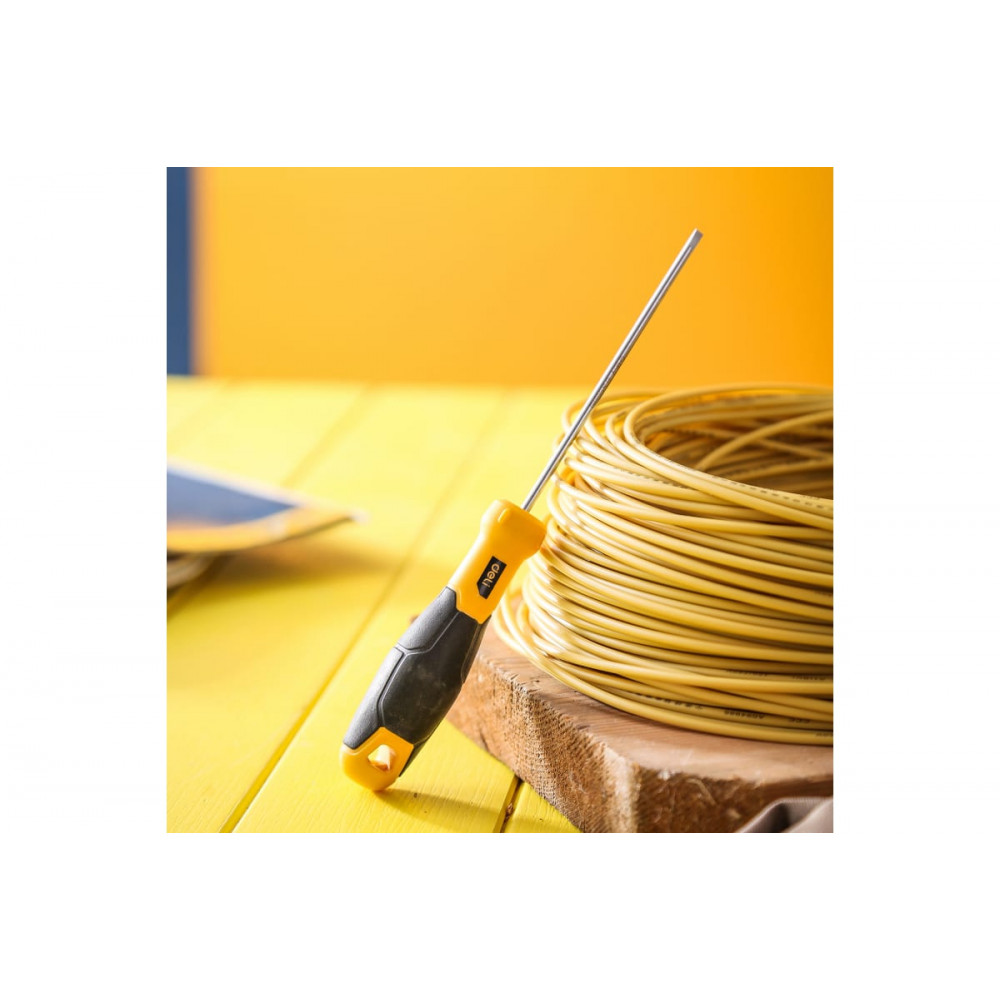 Отвёртка изготовлена из высококачественной хромванадиевой стали (CR-V), которая обеспечивает высокую прочность и устойчивость к коррозии. Кроме того, рукоятка отвёртки выполнена из пластика ABS, что обеспечивает удобный захват и предотвращает скольжение в руке.