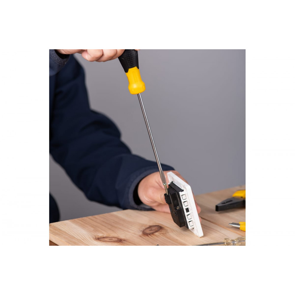 Отвёртка изготовлена из высококачественной хромванадиевой стали (CR-V), которая обеспечивает высокую прочность и устойчивость к коррозии. Кроме того, рукоятка отвёртки выполнена из пластика ABS, что обеспечивает удобный захват и предотвращает скольжение в руке.