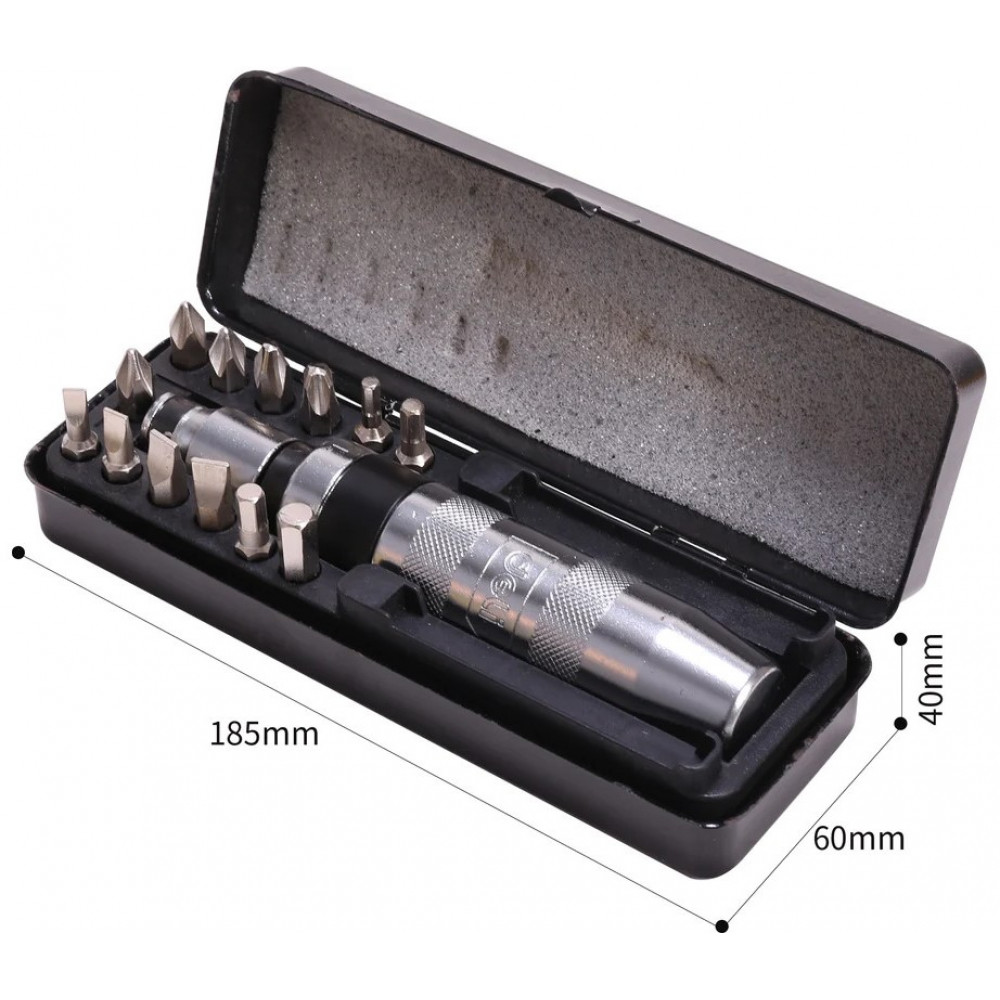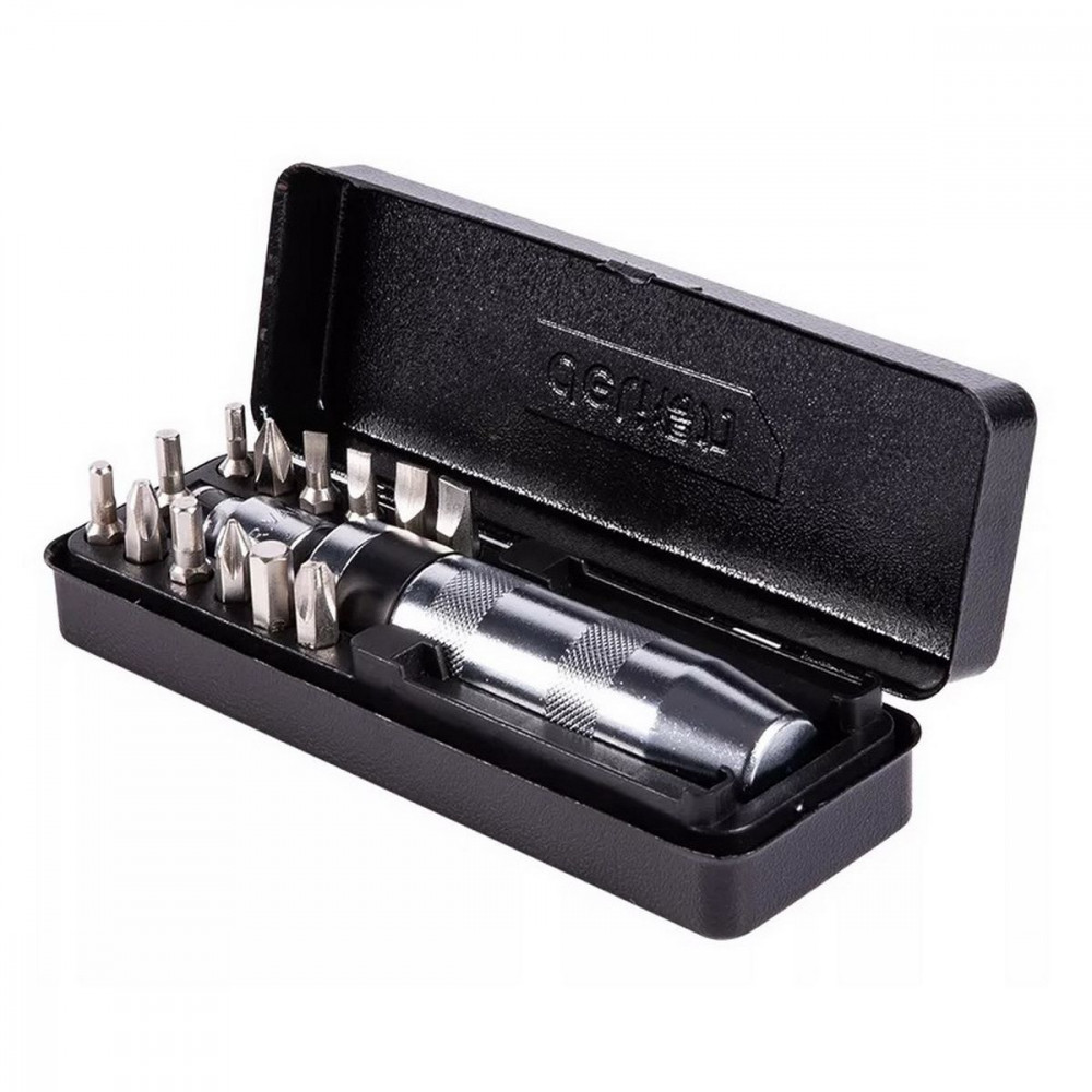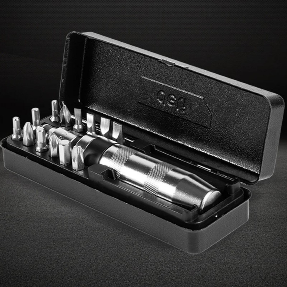 Металлический кейс, входящий в комплект, обеспечивает удобное хранение и транспортировку отвертки и бит.