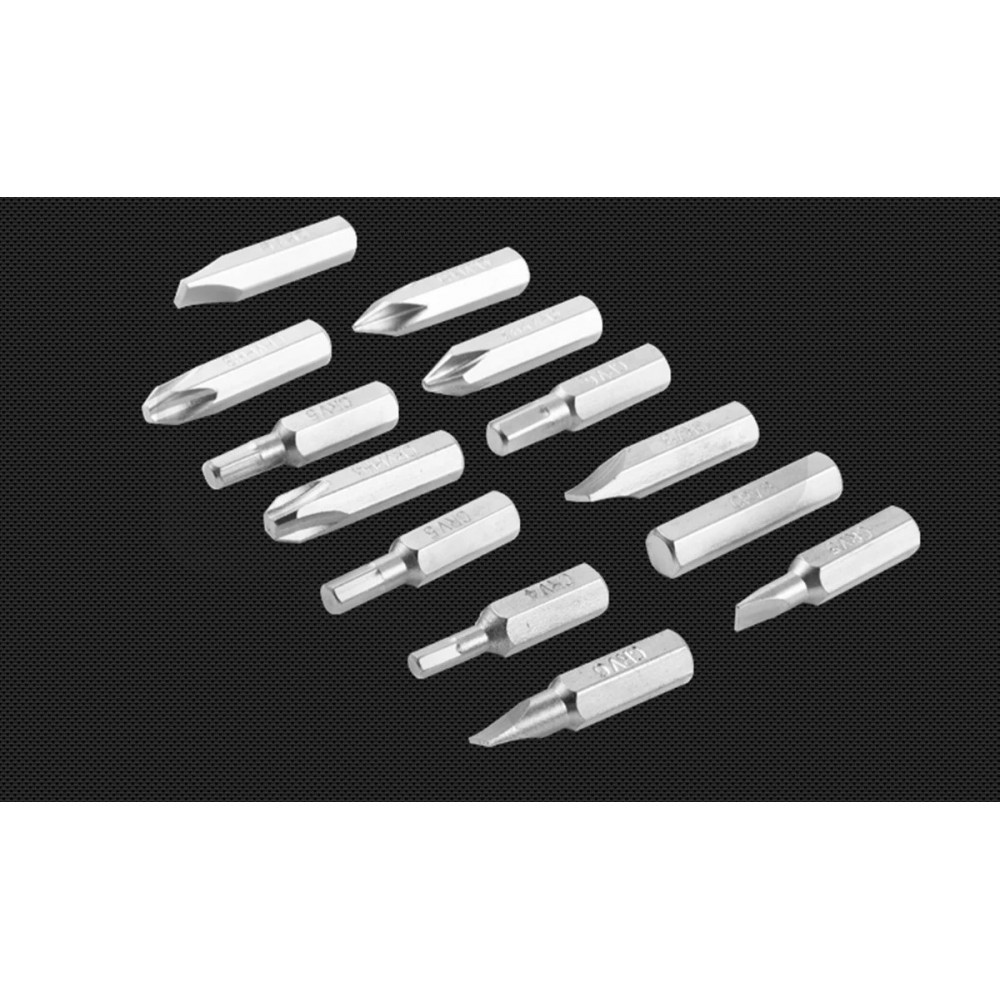 В комплекте с отверткой идут 13 бит различных размеров и типов: PH1, PH2x2, PH3, PH4, SL5, SL6, SL8, SL9, H4, H5, H6, H8. Это позволяет использовать отвертку для работы с различными видами крепежа и материалов.