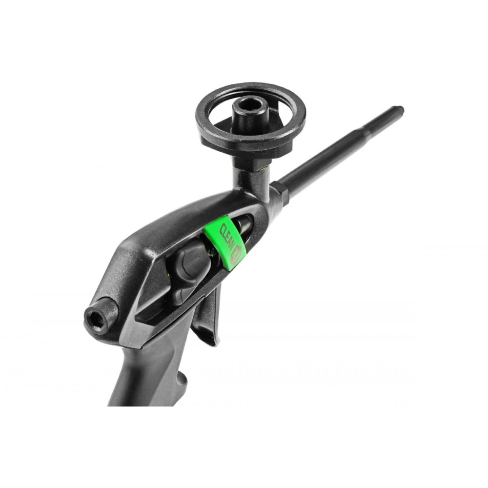 Регулятор подачи пены имеет удобное расположение со стороны курка и позволяет легко регулировать количество подаваемой пены одной рукой, что особенно важно при работе в труднодоступных местах. Рукоятка пистолета изготовлена из легкого и прочного пластика и имеет эргономичную форму, обеспечивая комфортное и надежное удержание инструмента в руке при выполнении различных монтажных работ.