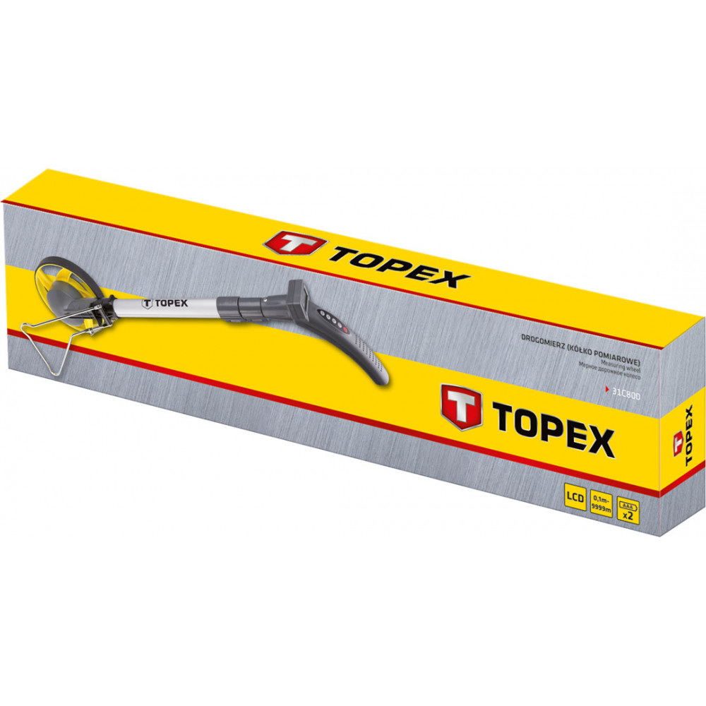 Мерное дорожное колесо TOPEX 31C800 подходит для измерения больших расстояний - до 10000 метров. Точность составляет ± 0.5%. В качестве источника питания инструмента используются две батареи типа ААА.