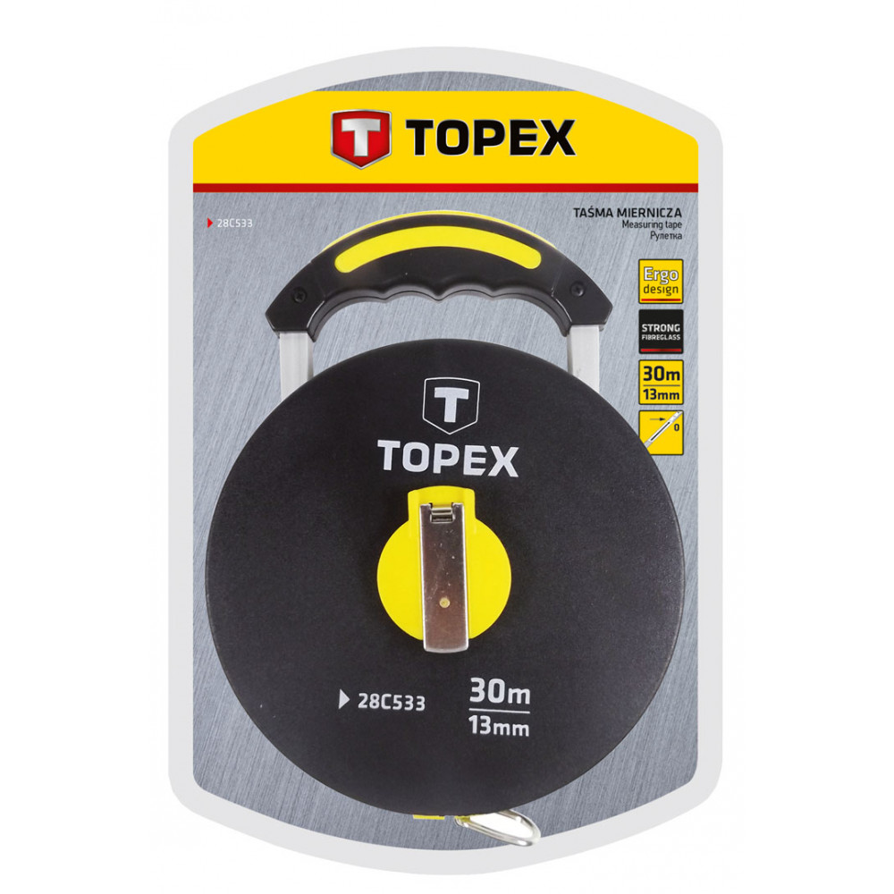 Лента измерительная TOPEX со смещенной точкой „0”. Лента изготовлена из прочного стекловолокна. Корпус из прочной пластмассы. Крючок позволяет закрепить конец ленты, что облегчает работу. Выдвижная ручка дает возможность удобно расположить ленту во время работы.
