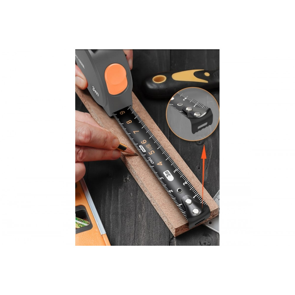 На задней стороне рулетки имеется специальная резиновая вставка, которая обеспечивает надежное сцепление инструмента с наклонной поверхностью. Это предотвращает случайное падение рулетки со стола или другой наклонной поверхности.Дизайн рулетки отличается изяществом и строгостью, что придает инструменту современный и стильный вид. Каждая деталь продумана до мелочей, что делает рулетку не только функциональным, но и эстетически привлекательным инструментом.