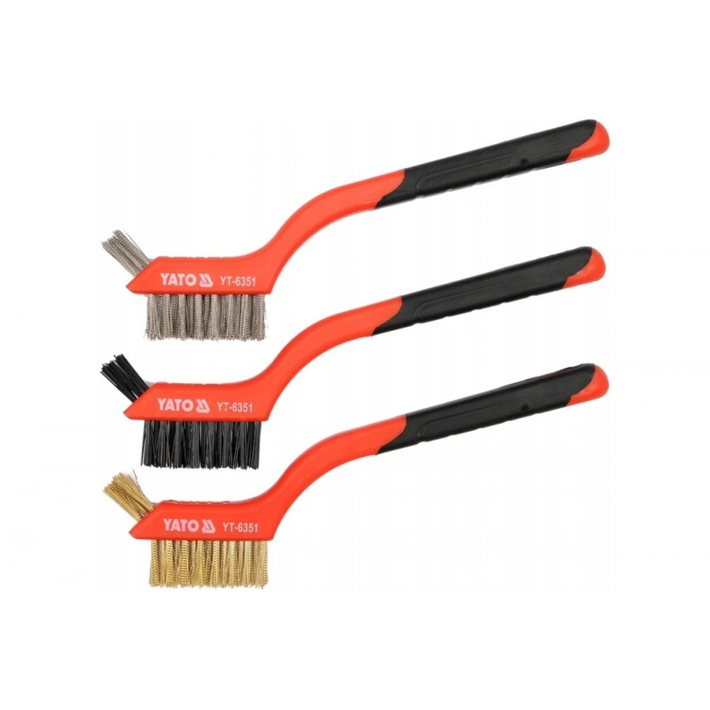 Набор металлических щеток YATO 3пр.180мм/пласт. ручкой YT-6351 предназначен для ручной полировки мелких металлических предметов, а также подходят для зачистки угловых сварных швов, очистки от шлаков, снятия старой краски и т.д. Щетки изготовлены из стальной проволоки, нейлона и латуни, оснащены изогнутой рукояткой из ударопрочного пластика для повышения эффективности очистки.