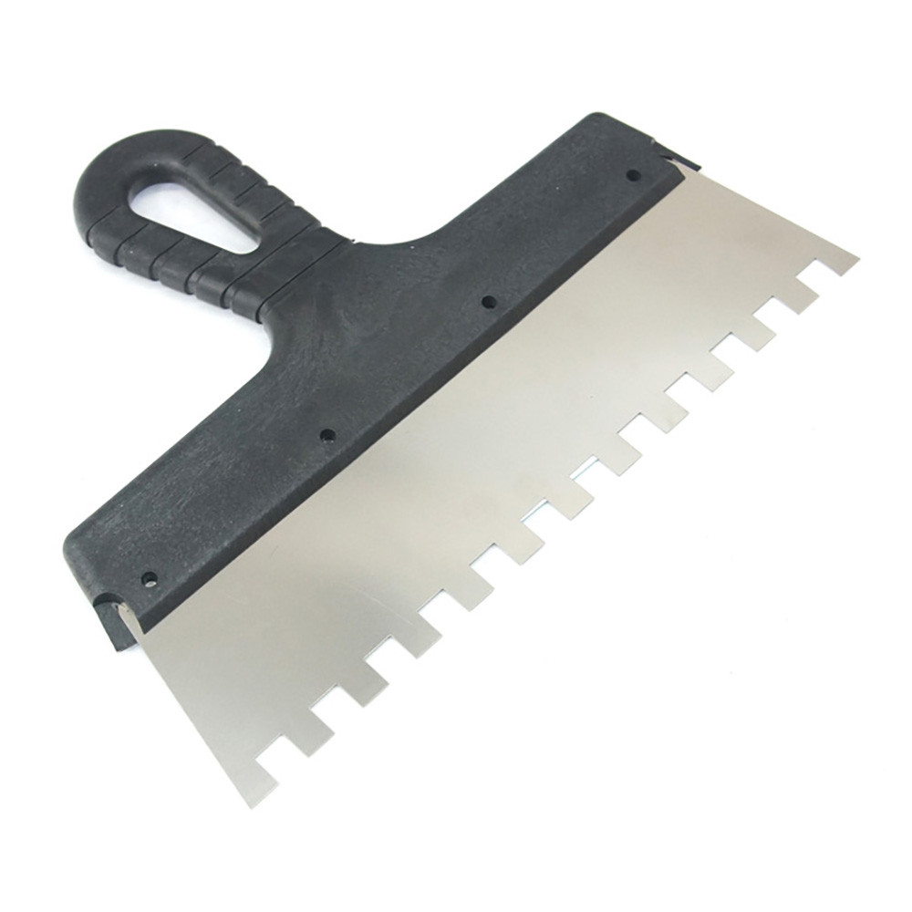 Основание выполнено из прочной нержавеющей стали, что гарантирует шпателю долгий срок службы. Эргономичная пластиковая ручка надежно и удобно располагается в ладони и имеет крепкое соединение с рабочим полотном. Шпатель имеет небольшой вес, прост в работе. Широкий размер полотна дает возможность захватывать большую площадь поверхности для нанесения клея. Благодаря наличию зубцов такой инструмент обеспечивает равномерное нанесение клеящего состава на горизонтальные и вертикальные поверхности. При необходимости инструмент можно подвешивать, используя отверстие в рукоятке.