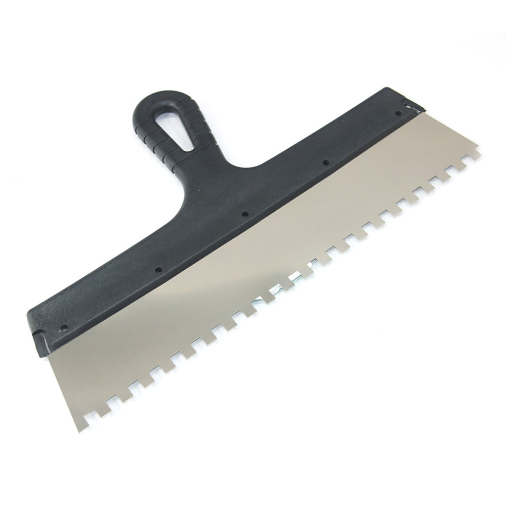 Основание выполнено из прочной нержавеющей стали, что гарантирует шпателю долгий срок службы. Эргономичная пластиковая ручка надежно и удобно располагается в ладони и имеет крепкое соединение с рабочим полотном. Шпатель имеет небольшой вес, прост в работе. Широкий размер полотна дает возможность захватывать большую площадь поверхности для нанесения клея. Благодаря наличию зубцов такой инструмент обеспечивает равномерное нанесение клеящего состава на горизонтальные и вертикальные поверхности. При необходимости инструмент можно подвешивать, используя отверстие в рукоятке.