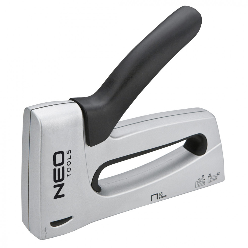 Степлер 16-015 от NEO предназначен для работы со скобами типа J, размером от 6 до 10 мм. Используется для выполнения крепежно-обивочных, отделочных работ, крепления пленки, кожи. Корпус изделия сделан из прочного алюминиевого сплава. Комфортную работу обеспечивает эргономичная и крепкая металлическая ручка с пластмассовым покрытием.